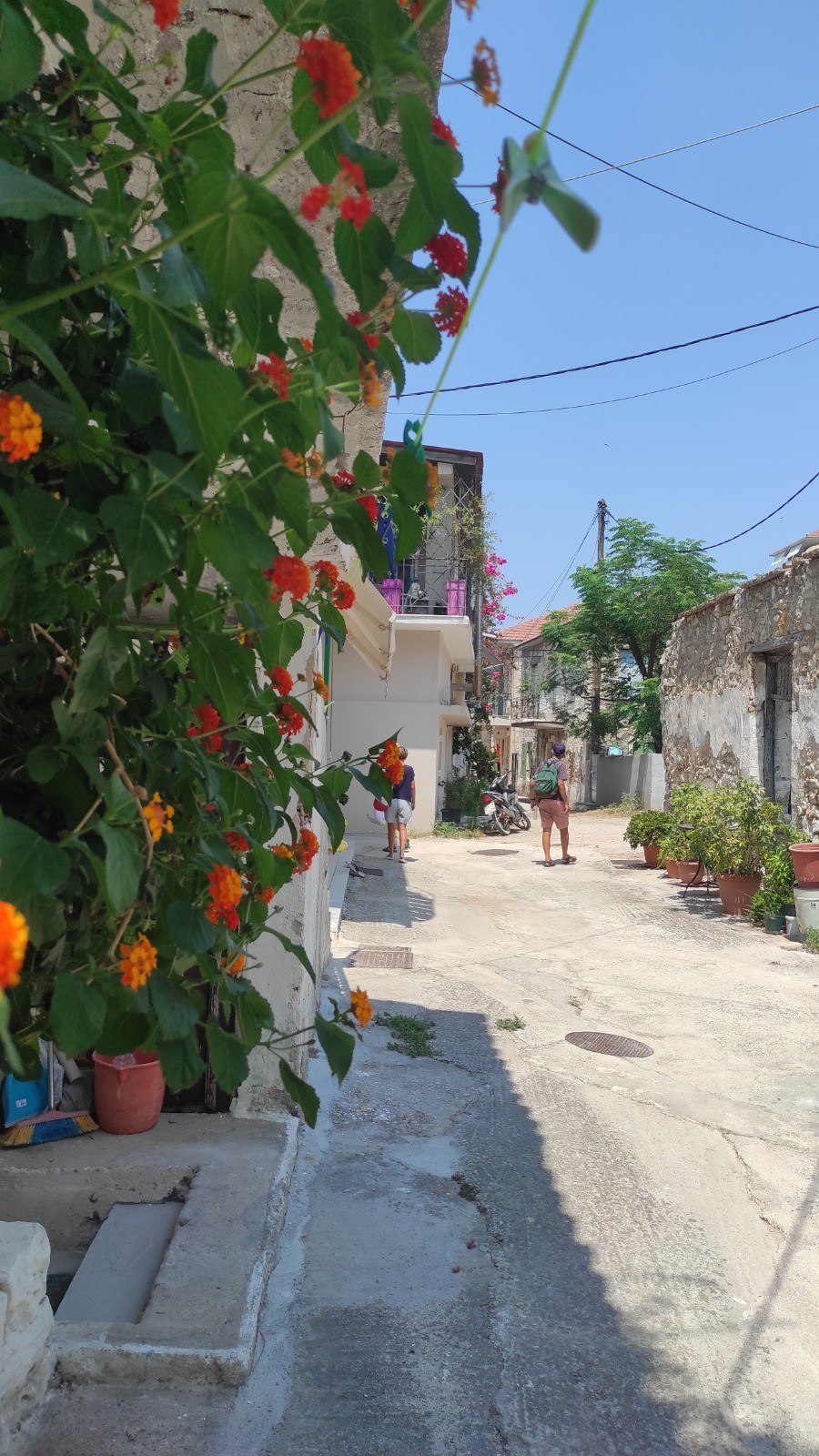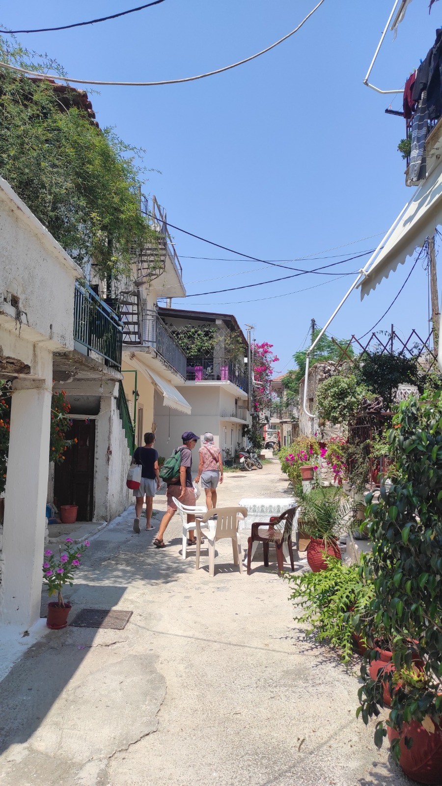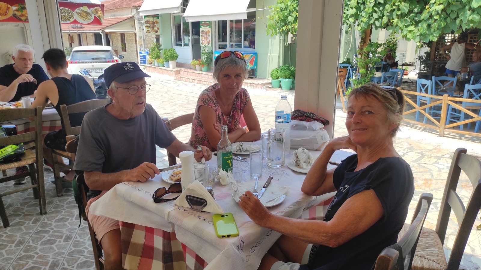 Journée tranquille, nous ne ferons qu'un aller-retour à Palairos au moteur. Un journée encore très chaude. On fait les courses classiques, eau, fruits...et taverne pour un giros pitas.