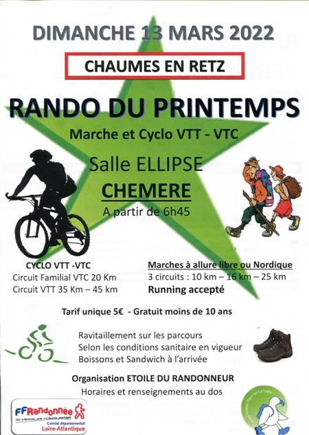 Etoile du randonneur de Chaumes en Retz organise, dimanche 13 Mars 2022, la première randonnée de la saison.