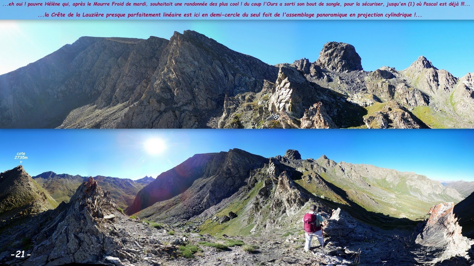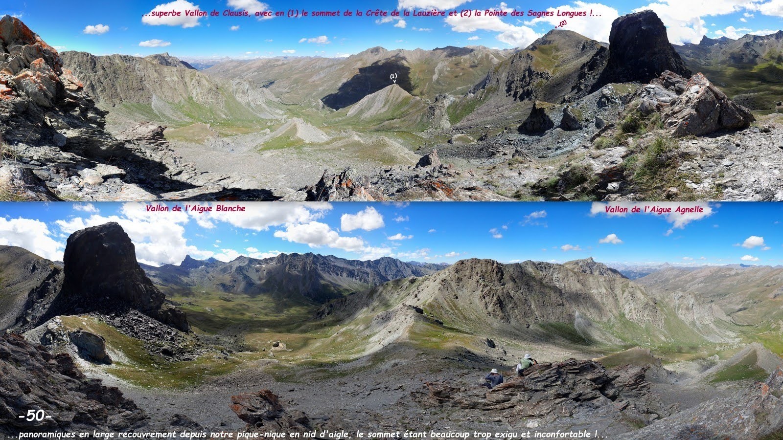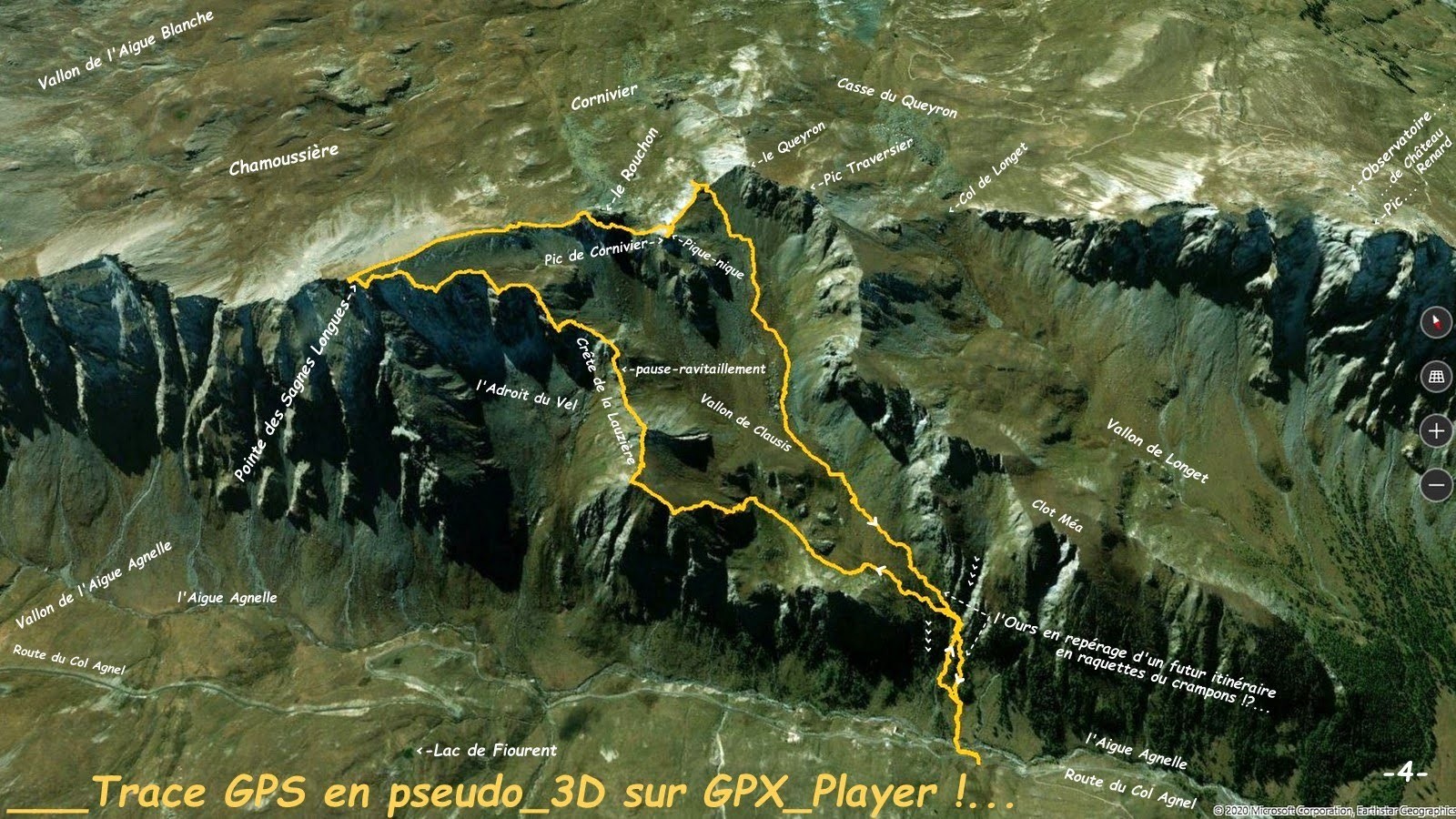 depuis le départ du bon sentier avant la passerelle sur l'Aigue Agnelle, à la cote d'environ 2170 m, sur la D205t, route du Col Agnel > le suivre jusqu'aux abords de la vaste zone humide, la contourner par la gauche et rejoindre le collet au Sud-Est > traverser à niveau la combe suspendue suivante en demi-entonnoir et grimper frontalement la rude pente d'accès direct à la Crête de la Lauzière (il est très facile d'en faire de même, de manière bien plus soft, en traversant légèrement plus haut !) > suivre la crête au plus près de son fil (herbeuse, puis rocheuse et très facile jusqu'à son cairn sommital) > roche déchiquetée avec soubassement schisteux bien plus aérienne et délicate à la descente, mais qui se passe aisément avec l'expérience de ce genre de terrain, extrême prudence, voire renoncement pour les autres ! au bout un nouveau double choix : toujours rester au plus près de la falaise et affronter le deuxième raidillon ou le contourner par la droite (Sud) et pour le spectacle revenir au plus vite sur cet immense balcon dentelé, c'est à son extrême bord que la progression est la plus aisée jusqu'au sommet > retour évident par le confortable sentier qui court sur la crête Ouest > nous avons choisi de contourner le Rouchon par le Nord en traversant un chaos de gros blocs écroulés aux étranges couleurs pour ensuite contourner les ressauts rocheux de la crête Est du Pic de Cornivier et accéder à son sommet par sa crête Sud-Ouest en A/R > Col de Clausis > retour par le sentier de son talweg hormis les 3 variantes de l'Ours, pour le chaos de blocs erratiques, le micro-lac bien au-dessus de la zone humide et la variante hivernale de franchissement des 2 couloirs avalancheux du verrou qu'il convient de ne pas prendre à la légère !...