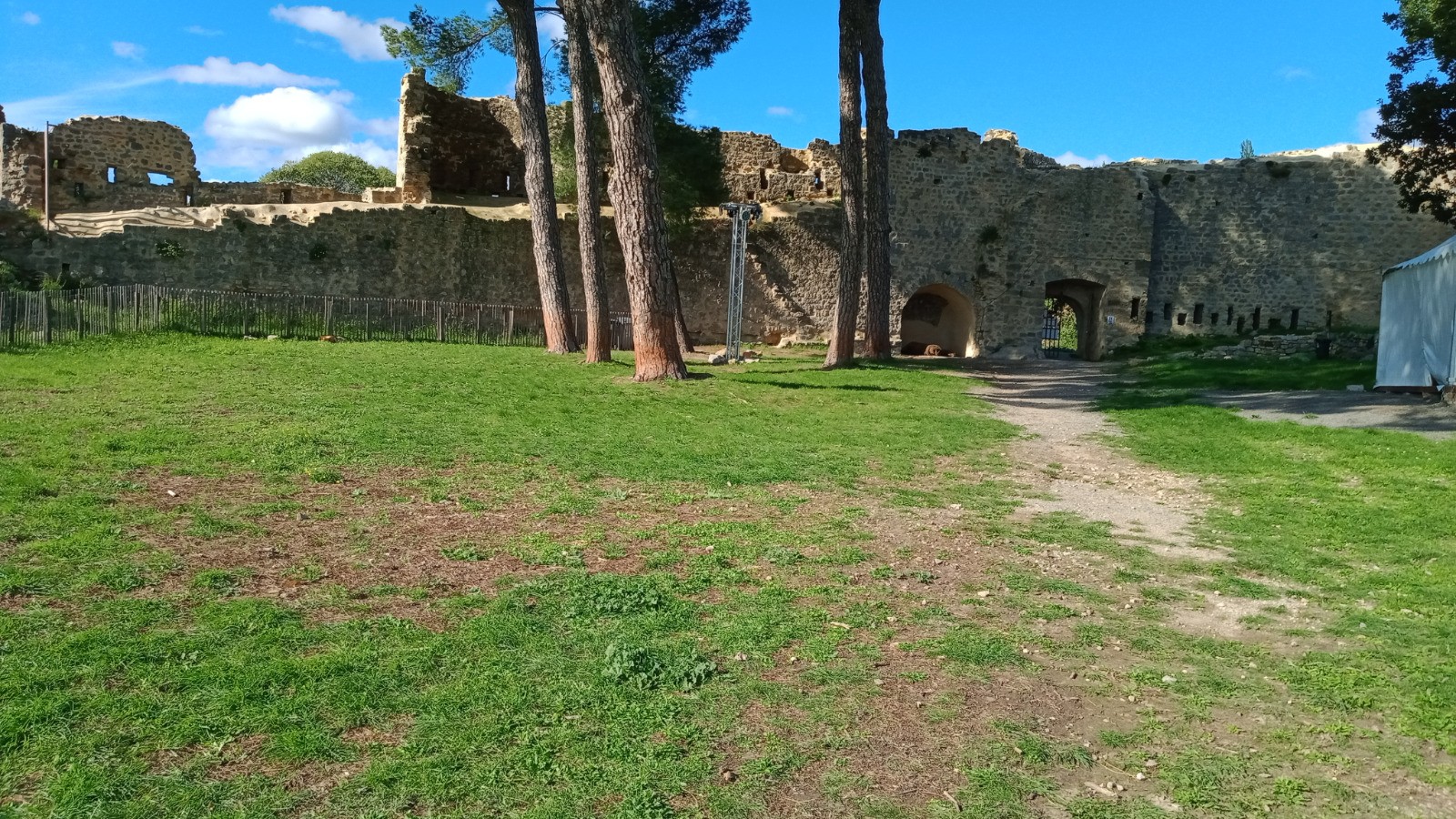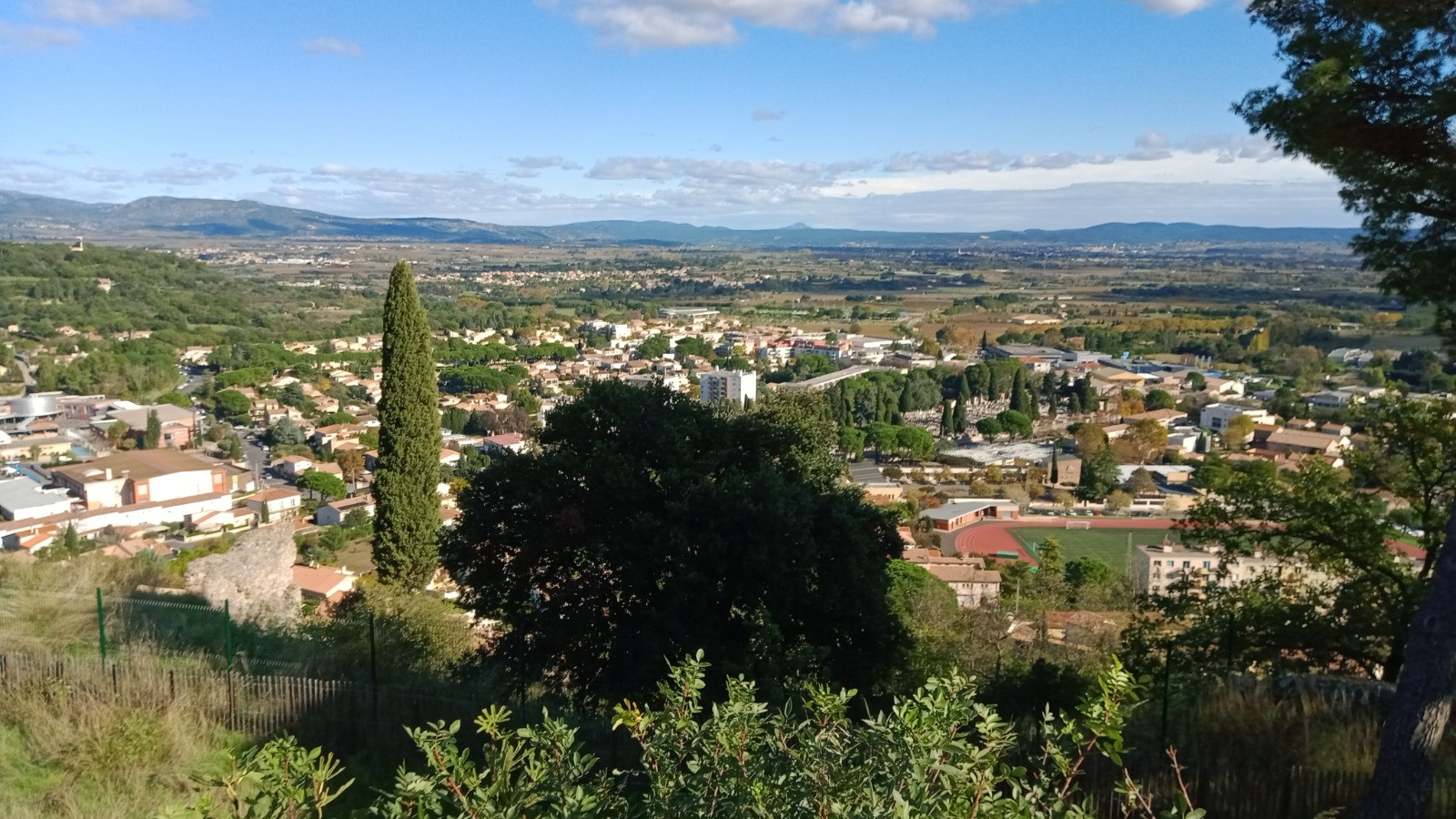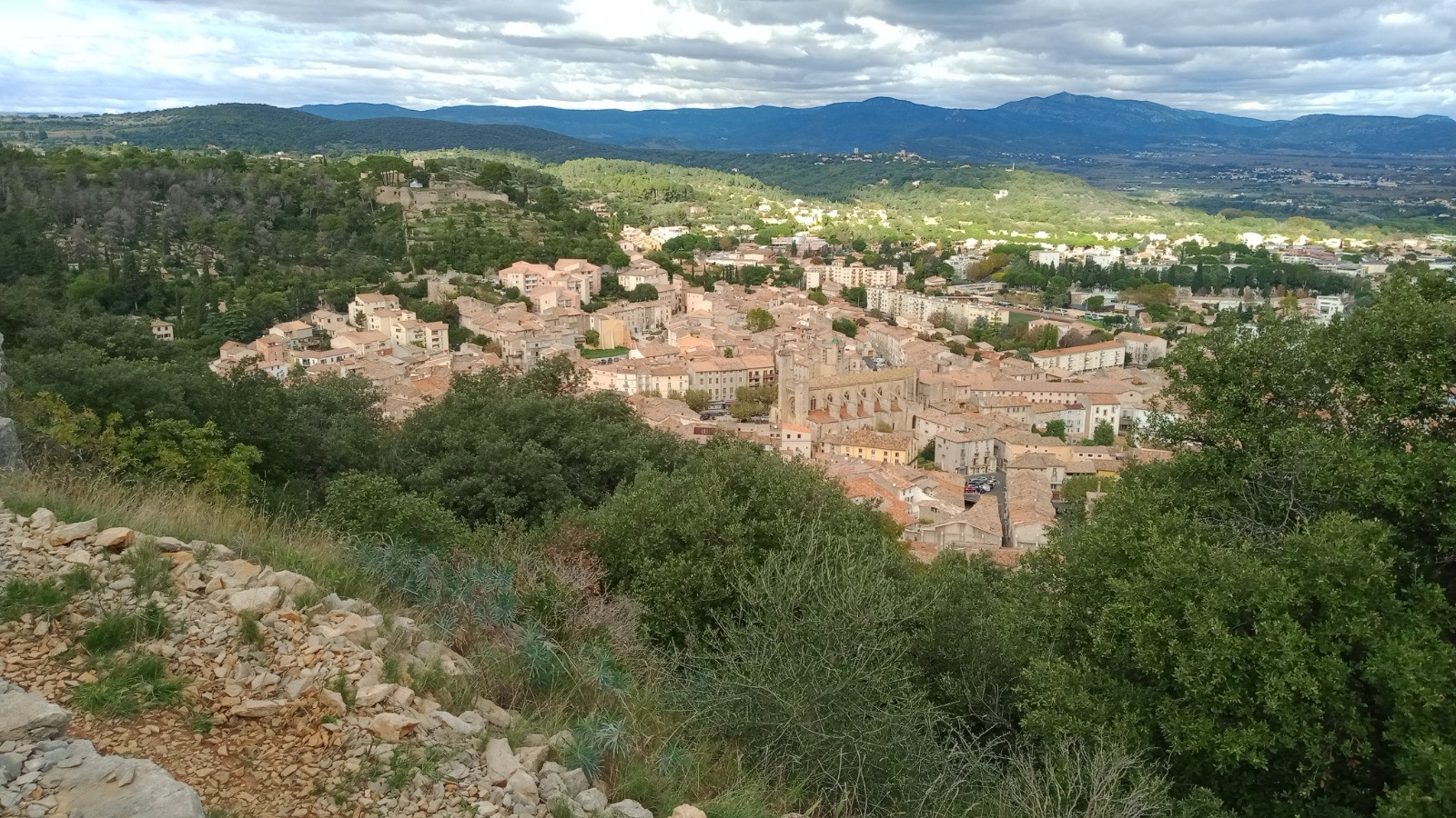 Au départ de l'ancienne manufacture de Villeneuvette, le chateau de Clermont et le mont Caylus