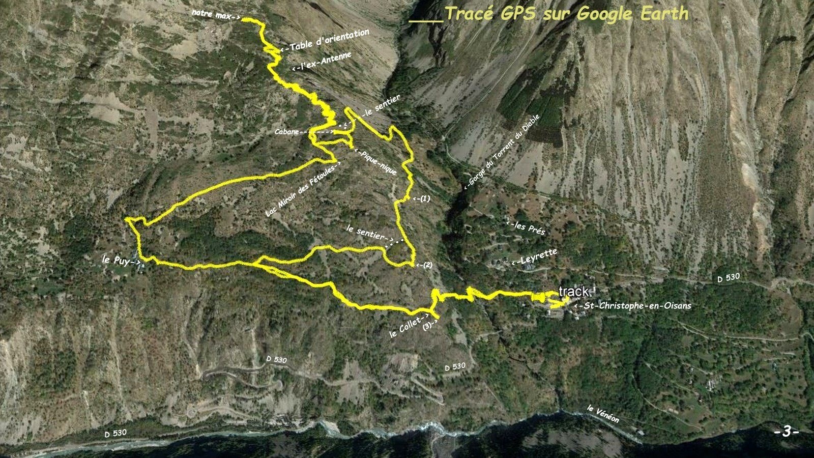 Depuis le parking, 1468 m GPS, sous le cimetière de St-Christophe-en-Oisans montée par le sentier muletier du Moulin du Diable qui passe à la Vierge de Collet pour rejoindre le Puy, un peu avant nous avons laissé à droite le départ du sentier escarpé de Combe Noire par lequel nous reviendrons. Du Puy nous avons continué par le sentier du Lac Miroir des Fétoules jusqu'au lac, d'où moyennant une petite variante nous avons poursuivi vers le nord sur la croupe herbeuse pour ensuite rejoindre le sentier balisé de la Brèche du Grand Creux par le petit collet, 1866m GPS, juste au-dessus de la cabane pastorale non répertoriée sur l'IGN, 1858 m GPS ; par lequel nous avons poursuivi au-dessus de la Table d'Orientation jusqu'au lieu dit Pierre Grosse à environ 2200 m (comme souvent l'enregistrement des données GPS de ma montre est ici plus que folklorique malgré les excellentes conditions météorologiques et une position bien dégagée, une vraie calamité !). Retour par le même itinéraire jusqu'à la croupe au-dessus du micro-lac pour un pique-nique bien ombragé. Descente par le sentier des Prés jusqu'au départ du sentier de Combe Noire très aérien et escarpé, avec une autre petite variante pour la visite de la belle croupe des Côtes qui offre de belles échappées sur St-Christophe et la Gorge de Torrent du Diable. Pour ensuite rejoindre l'itinéraire de montée pour retourner sur St-Christophe et le parking.