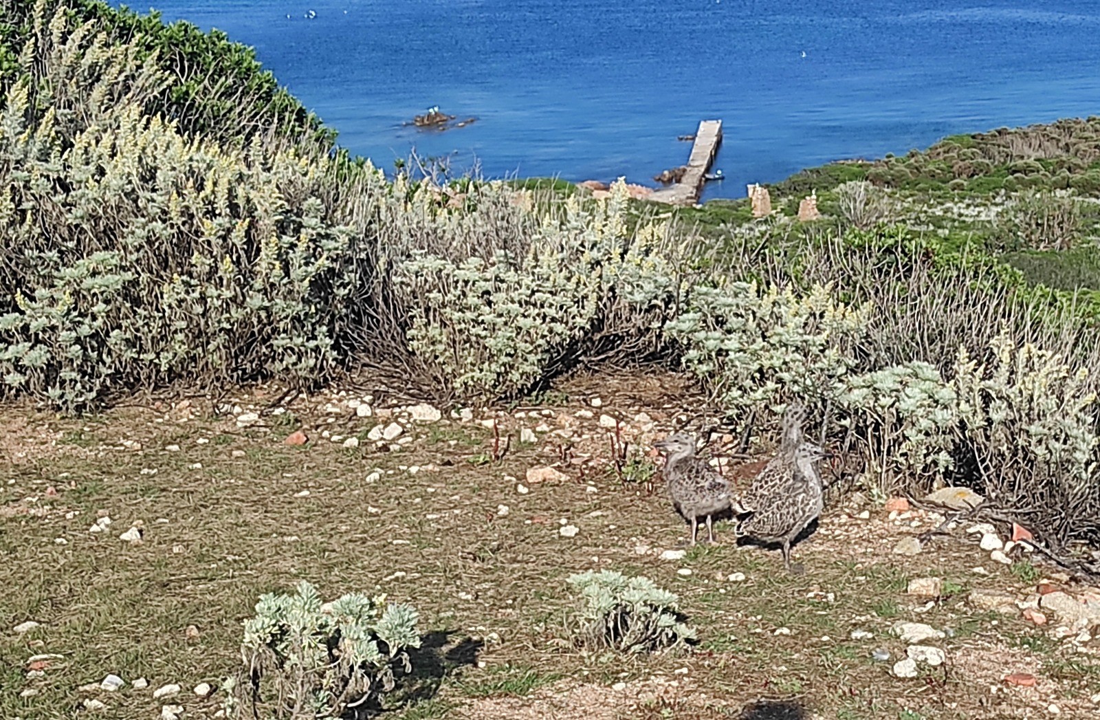 Arrivée vers midi, repas d'un délicieux ceviche de thon (vous vous en doutiez) pomme de terre, sieste bien méritée, gonflage de l'annexe et c'est parti pour l'île envahie par les goélands. Ballade au phare, à l'ancien sémaphore. Je ne pousse pas jusqu'à la tour, les goélands y protègent leurs petits, boules grises pataudes. Ça gueule e permanence le goéland.