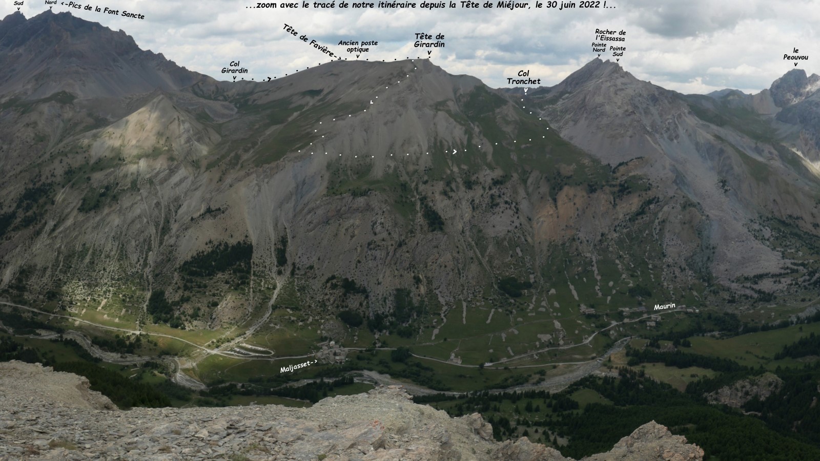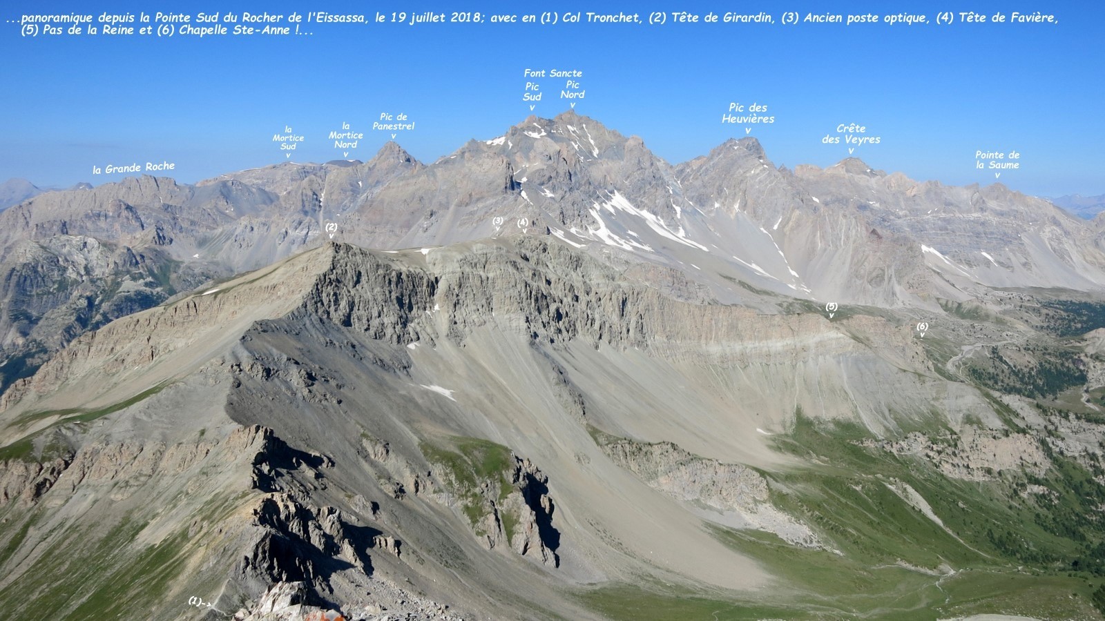 Tous le reste est suffisamment détaillé dans notre diaporama dont le lien est au-dessous de la carte sur cette fiche pour que j'y ajoute mon grain de sel. Sinon peut-être pour noter combien est encore vif le souvenir de l'hallucinante volée de bois vert qui lui a été administrée lorsqu'il est revenu à l'ancien poste optique pour le pique-nique, pour avoir soi-disant bafoué les règles les plus élémentaires de la bienséance en osant nous proposer la variante de la crête Nord-Ouest de la Tête de Favière en 2015 pour satisfaire ses seules ambitions. Le pauvre, lui qui est toujours aussi attentif à tous les autres était à mille lieux d'imaginer chose pareille, d'autant qu'il avait déjà accompagné sur cet itinéraire par le Pas de la Reine des randonneurs toulonnais (Marmotte comprise !) de leur petit groupe baptisé Randos-Intuitives, (tiens, tiens !), depuis leur camp de base à Ceillac au cours de l'une de leurs nombreuses semaines alpines bien avant d'avoir à se frotter au rugueux caractère de certains Hauts-Alpins. Alors qu'il s'agissait tout simplement pour lui de nous faire découvrir cette sauvage et spectaculaire crête offrant un panorama à couper le souffle sans égal sur les Prés de Tronchet en particulier et sur tout le vallon de Tronchet en général, sauf pour les quelques rares qui ont les moyens d'accéder au sommet du Rocher de l'Eissassa et