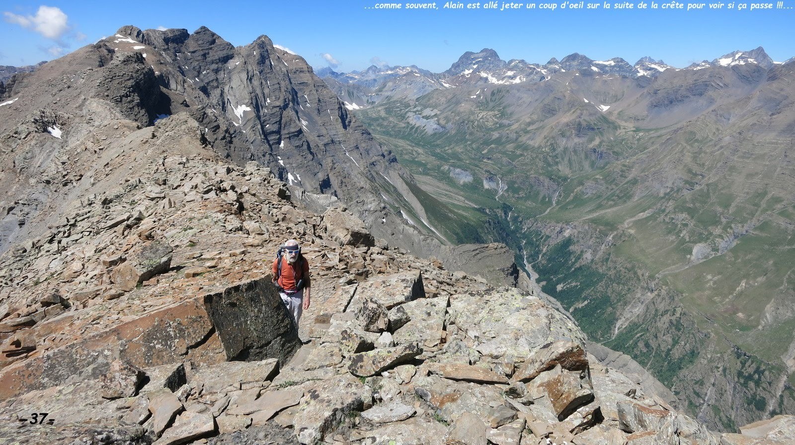 Depuis que je connais cette profonde Vallée de Freissinières, j'ai toujours été intéressé par sa toute aussi impressionnante et plus secrète barrière Nord (la Sud étant très médiatisée par les amateurs de cascades de glaces!) que constitue la Crête de Dormillouse dont la Tête est son point culminant le plus oriental. La déjà ancienne découverte de l'itinéraire proposé par Frédéric Chevaillot dans son son recueil de Topos (Le Guide Rando des Écrins Vol.2 (Brianonnais - Vallouise - Embrunais) Rando Éditions / ESO), pages 68 à 71, sous forme de défi avait immédiatement retenu mon attention, mais il m'a fallu attendre jusqu'ici pour trouver des coéquipiers acceptant de le relever. De retour, ils en ont conclu que si l'épreuve était certes un peu rude du fait de la pente, l'ambiance sur tout le parcours en crête et l'époustouflant panorama d'un sommet aussi singulier en faisait vite oublier l'effort consenti ! Pour tous ceux qui renonce à surmonter un tel dénivelé sur de telles pentes, il est évident qu'il vaut mieux partir du lacet à la côte 1869 m sur la route du Col d'Anon et suivre la piste du Clot du Seigneur, effectuer une traversée ascendante de la Charance pour rejoindre le Vallon de la Poua en coupant au-dessus de la cote 2073 m, pour le remonter jusqu'au point culminant de la crête des Crêtes et suivre la crête sommitale jusqu'à l'Étoile, le dénivelé total est alors ramené à seulement 1270 m, une promenade en quelque-sorte !!!