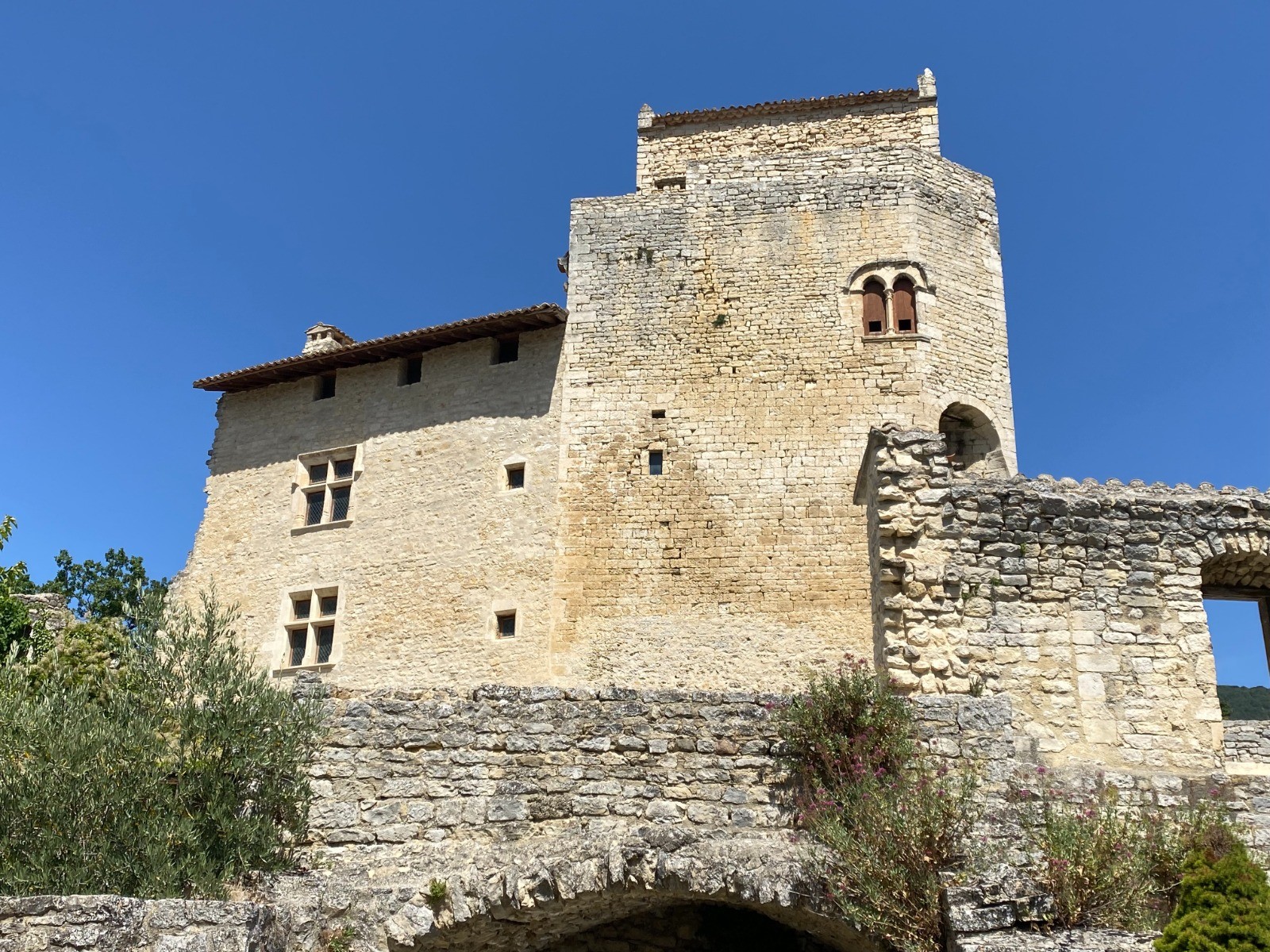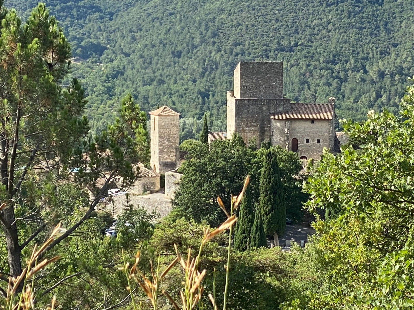 Sur la droite le donjon du vieux château du Poët-Laval s’élève parmi les arbres environnants. ( photo no 1 )