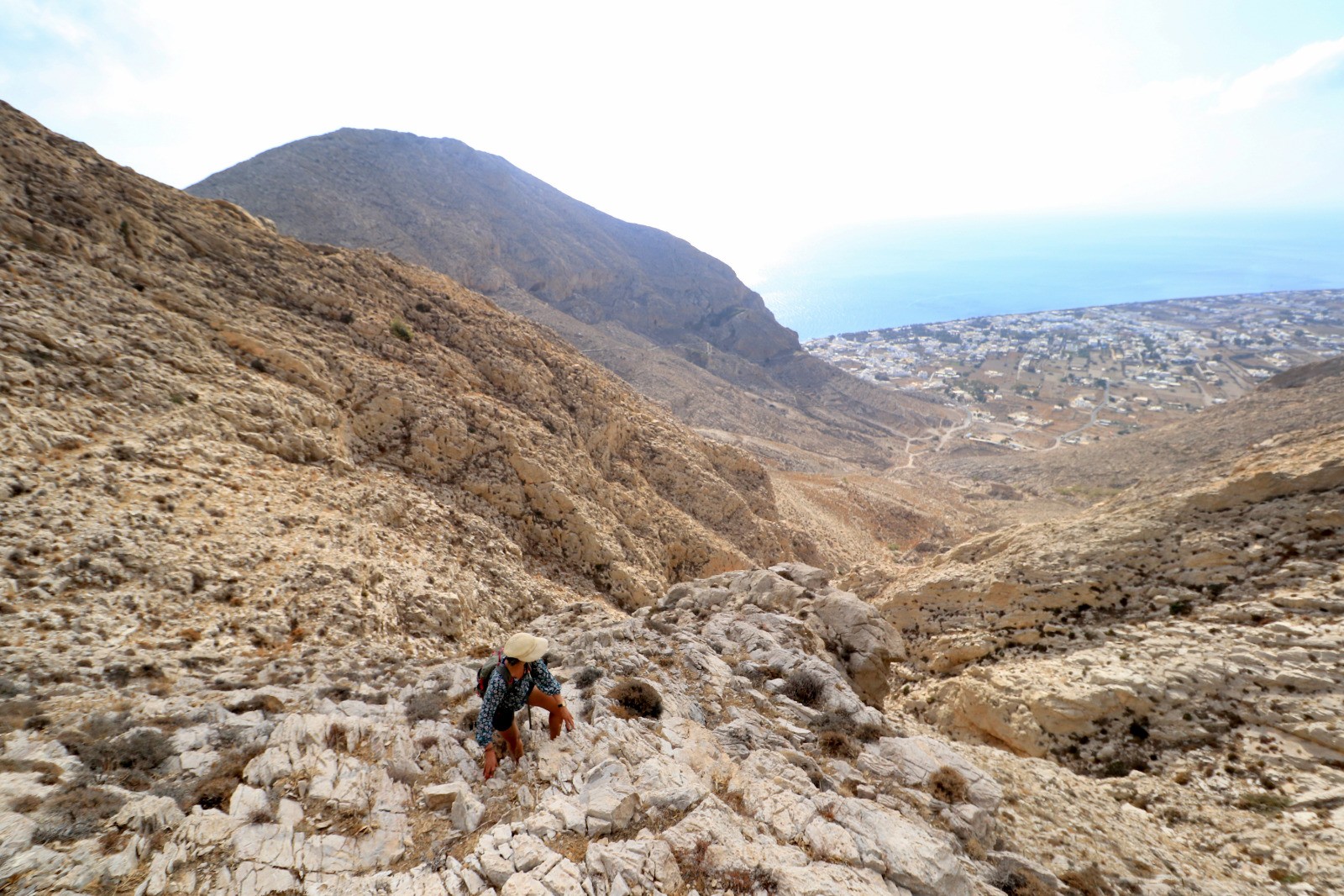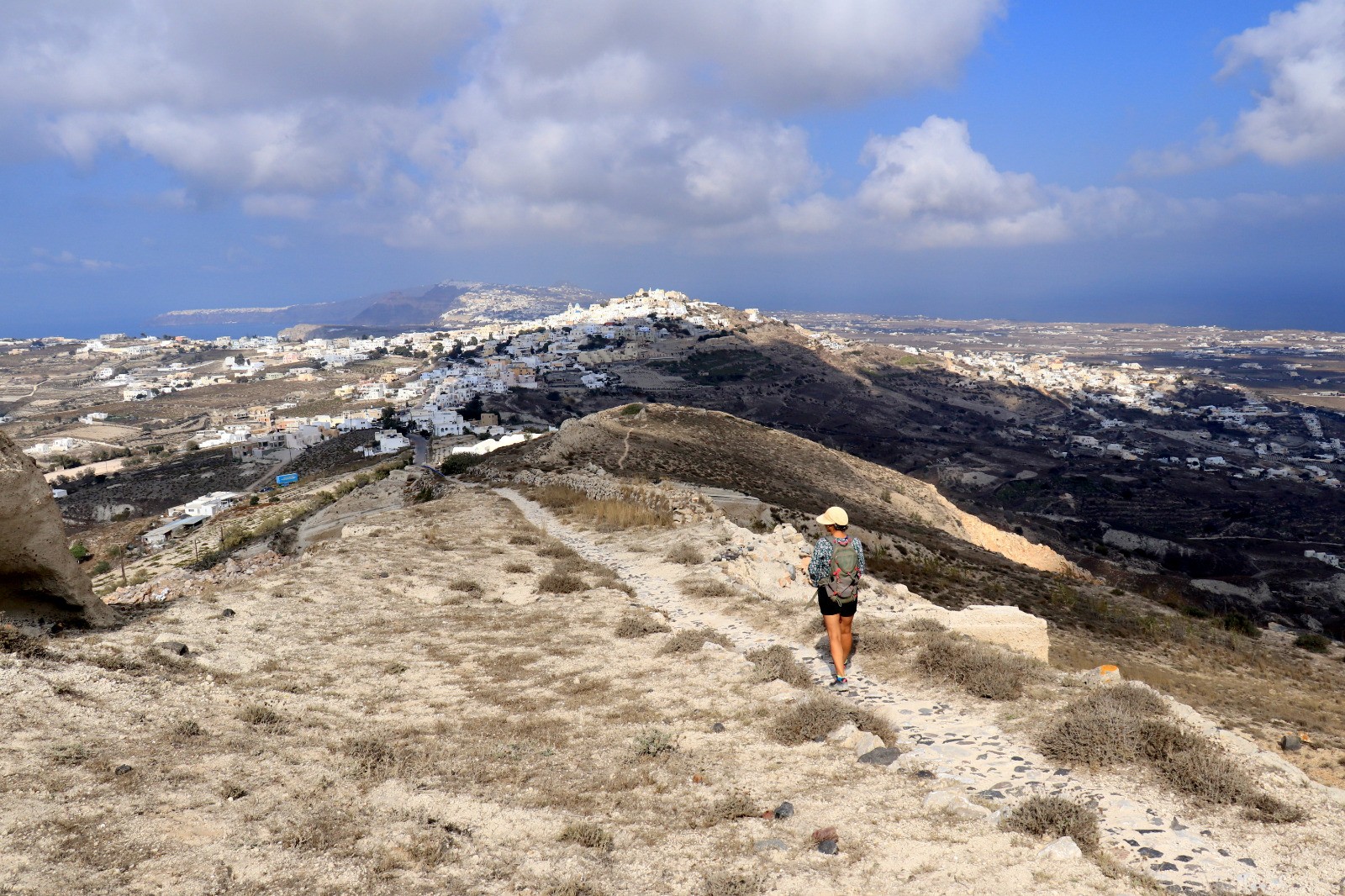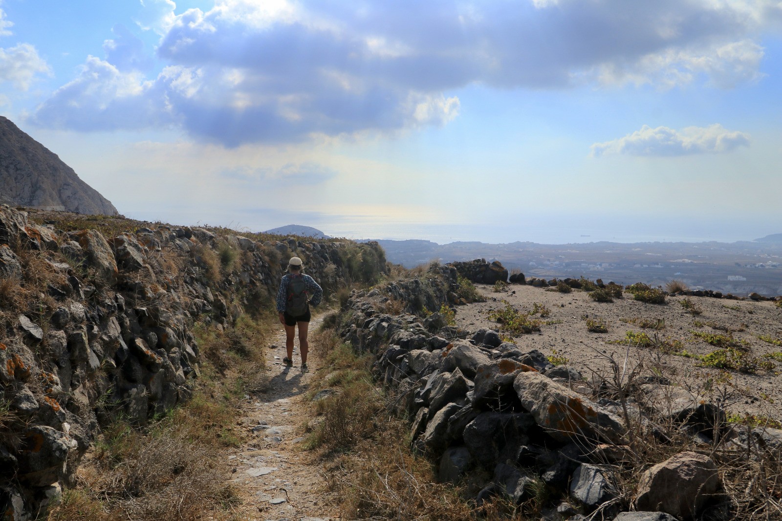 La descente commence par la route et se poursuit sur un vieux sentier délimité par un mur en pierres (ou ce qu'il en reste par endroit). La vue est superbe sur l'Ile et les villages de