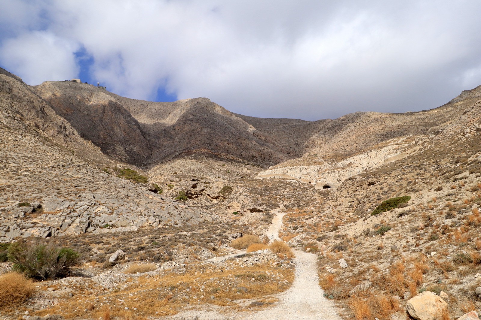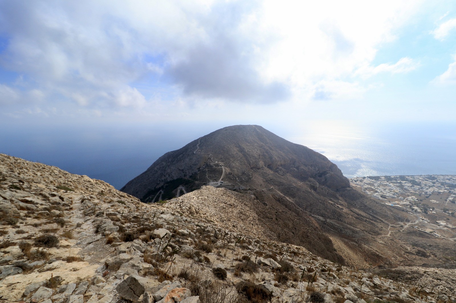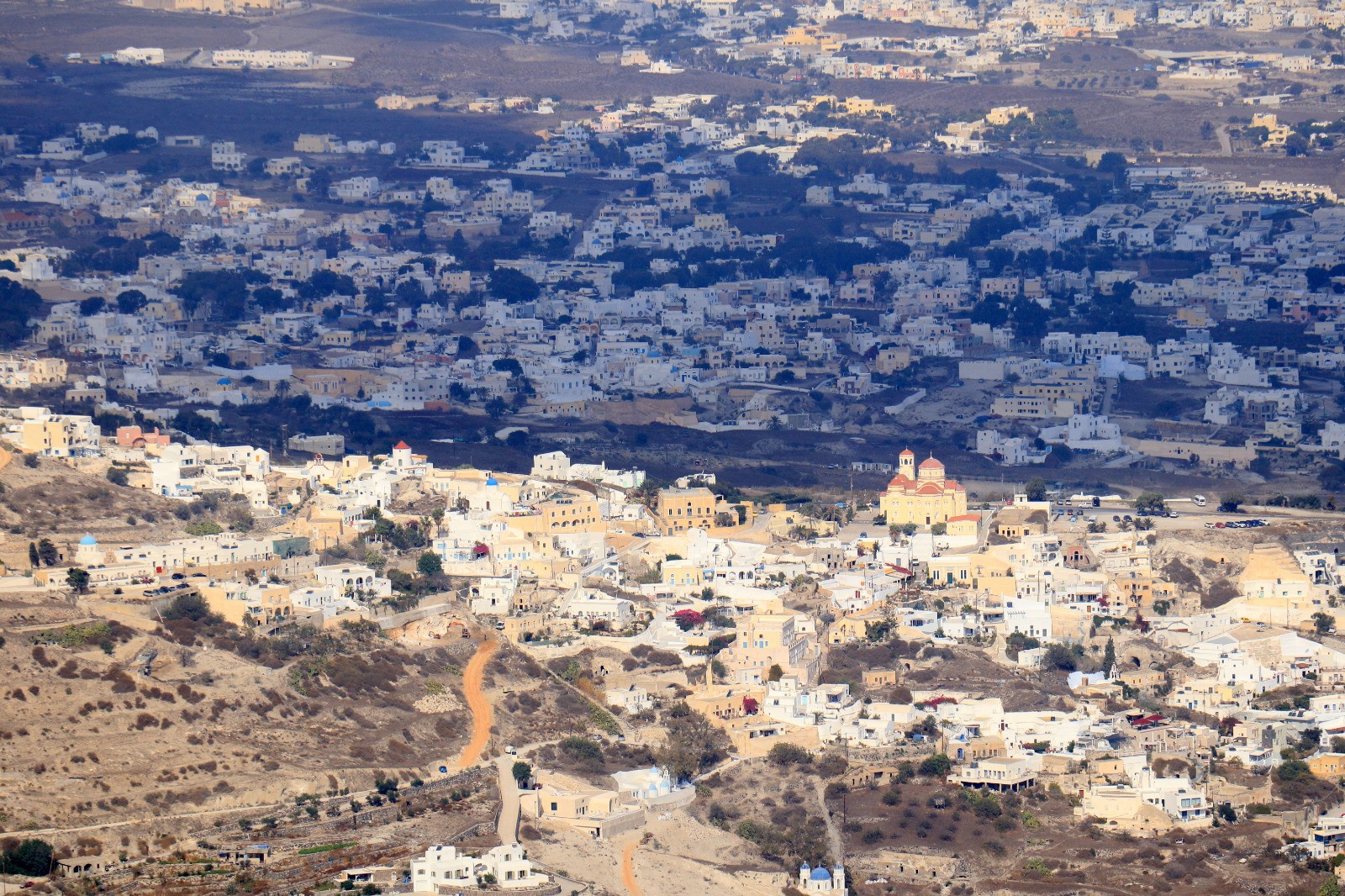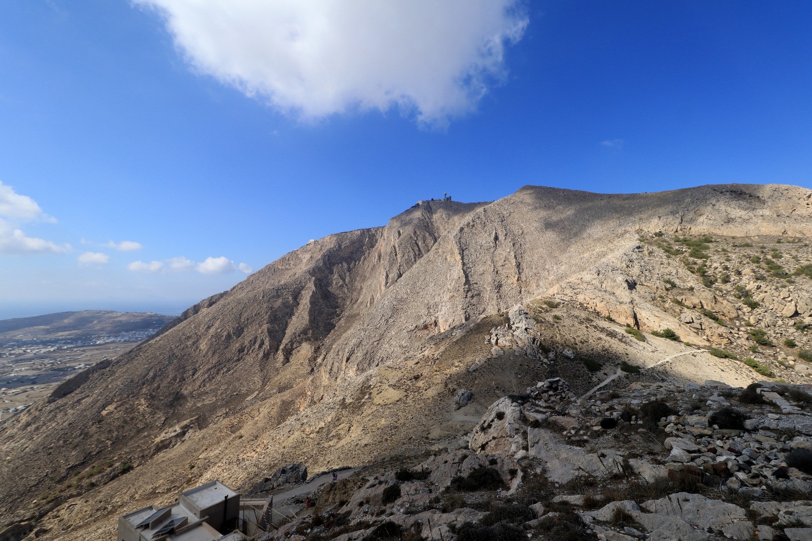 Mont Profitis Ilias (marques rouges) et le monastère (