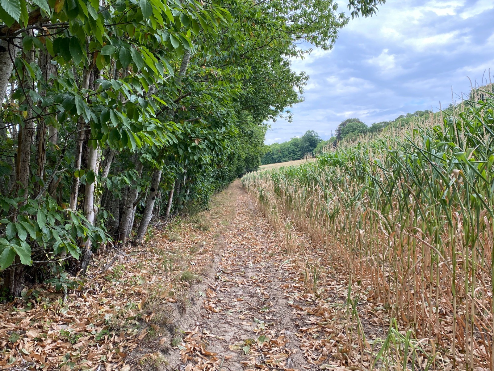 Entre les kilomètres 8 & 9 le chemin emprunte un champ à la lisère de la forêt et vous le retrouvez en longeant un grand champ de maïs ( photo no 15 ).