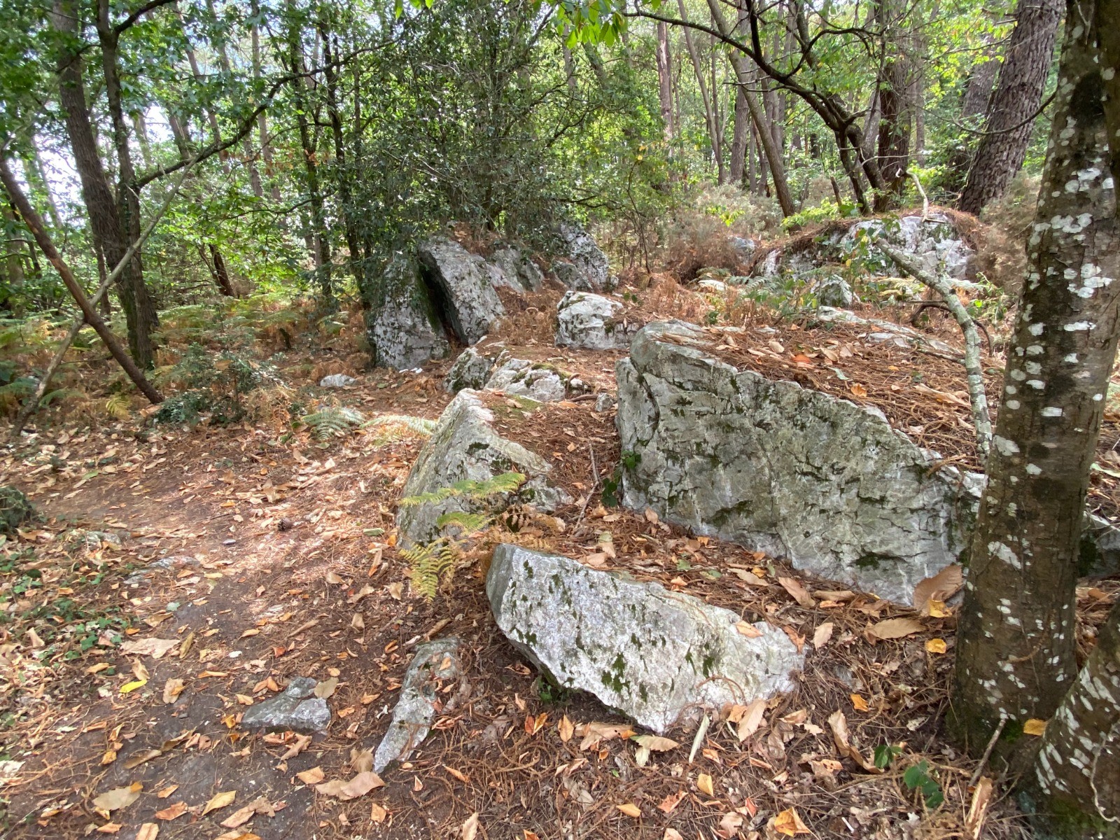 Vers le kilomètre 6 : des rochers ( photos no 11 à 13 ) de schiste aux formes étranges. Sur le panneau descriptif, il est question d'alignement de gré de la Close à découvrir...