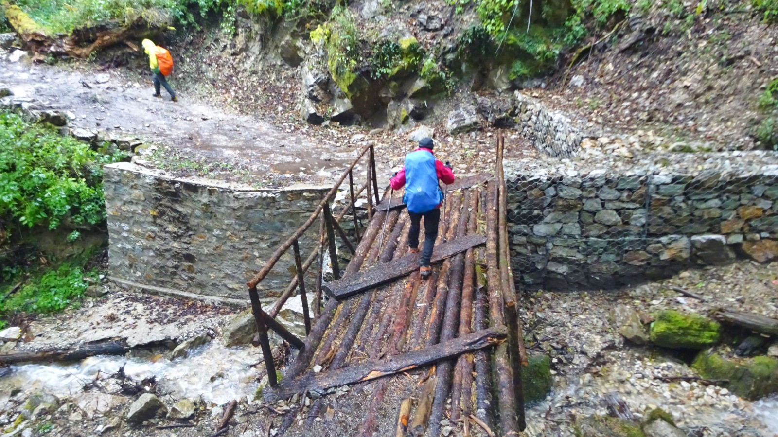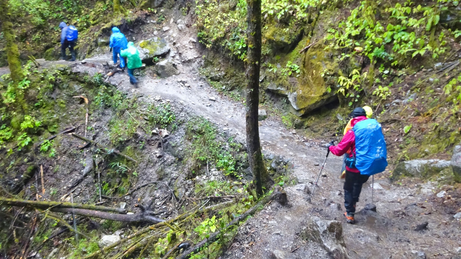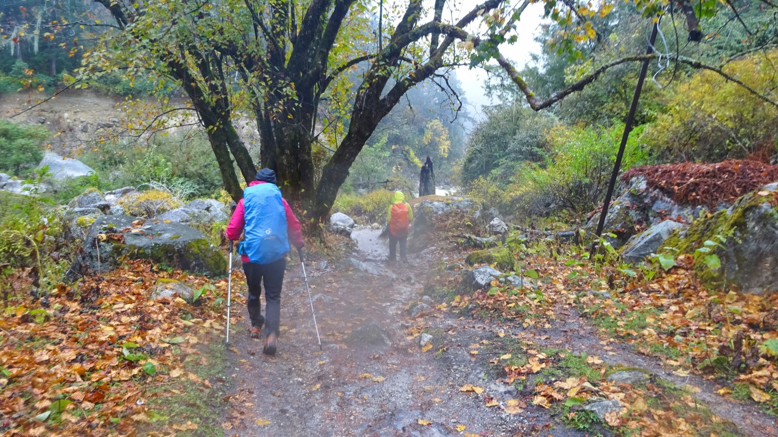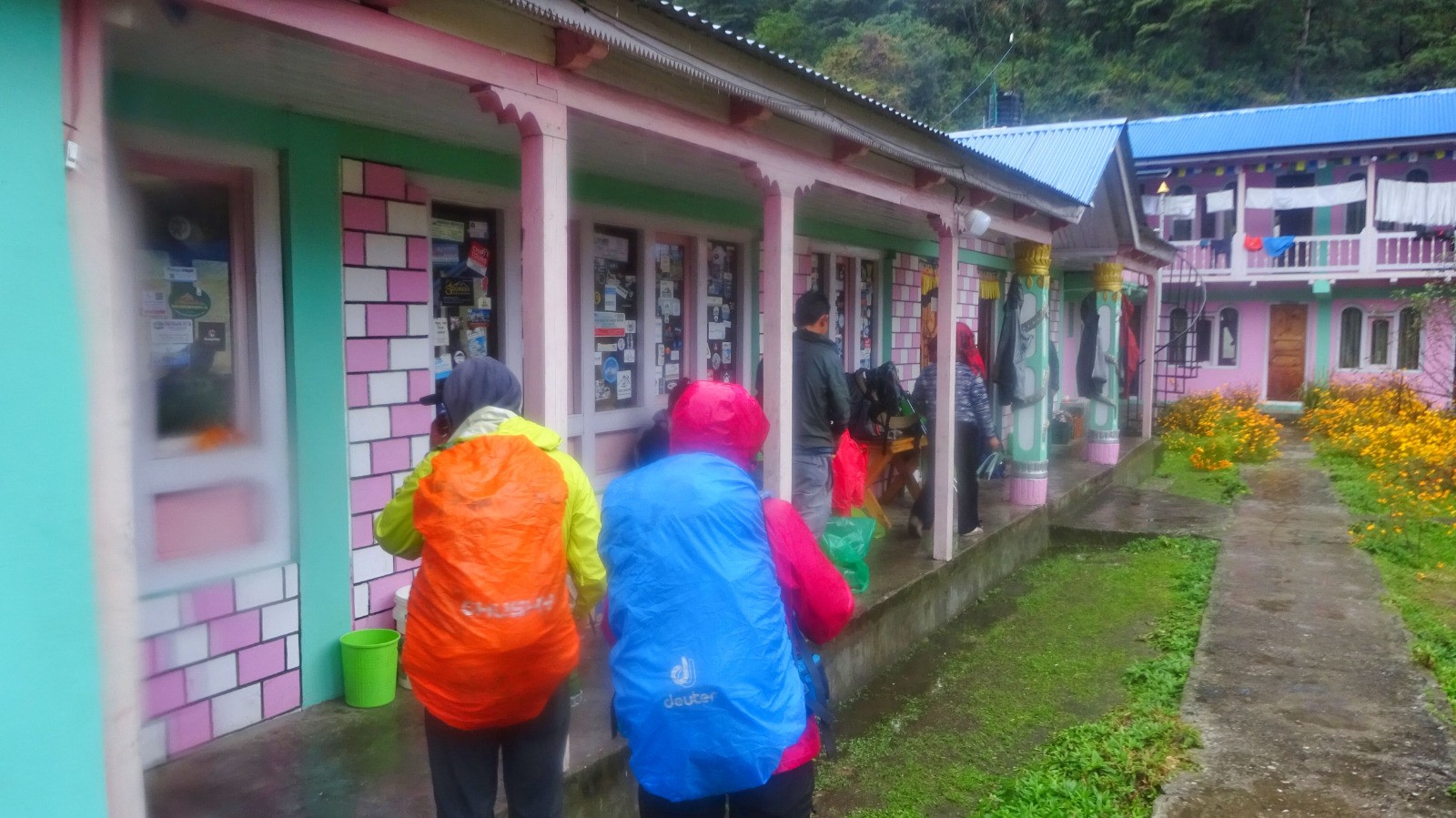 La neige se transforme en pluie, plus on perd de l'altitude plus le sentier se transforme en ruisseau et sur la fin on marche dans des mares boueuse, se sera comme cela jusqu'à la pause déjeuner (Surki Khola) ou tout le monde essais de se mettre à l'abri et de se réchauffer.