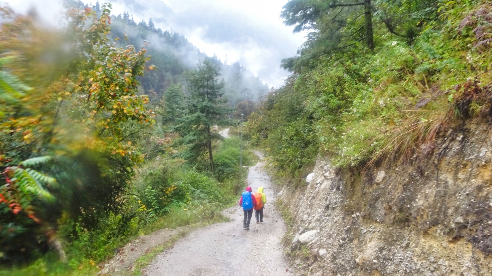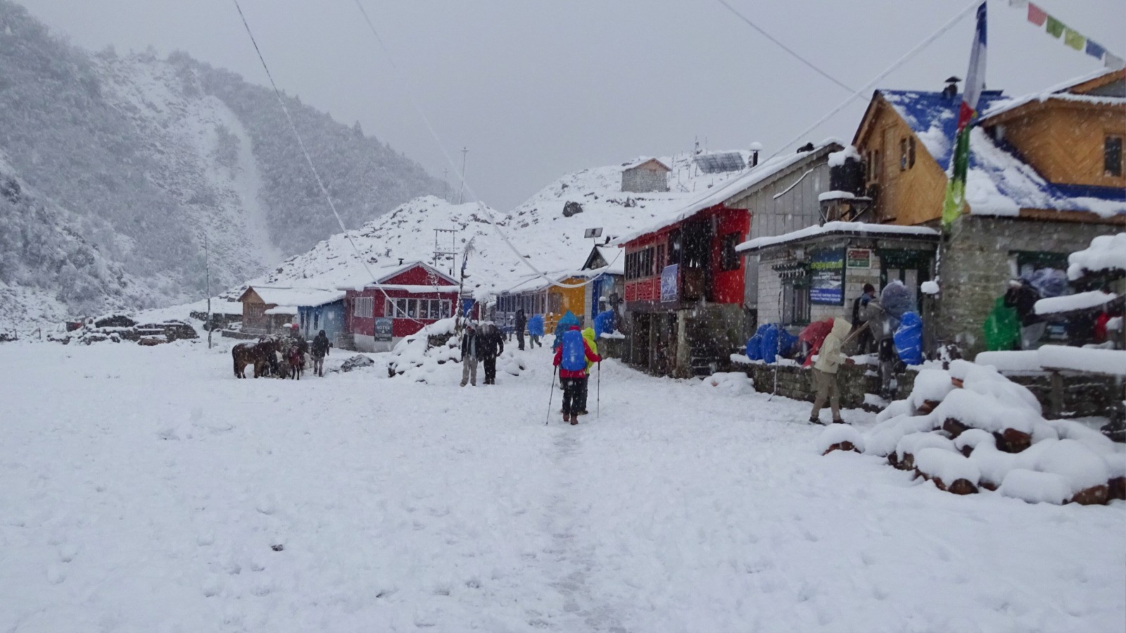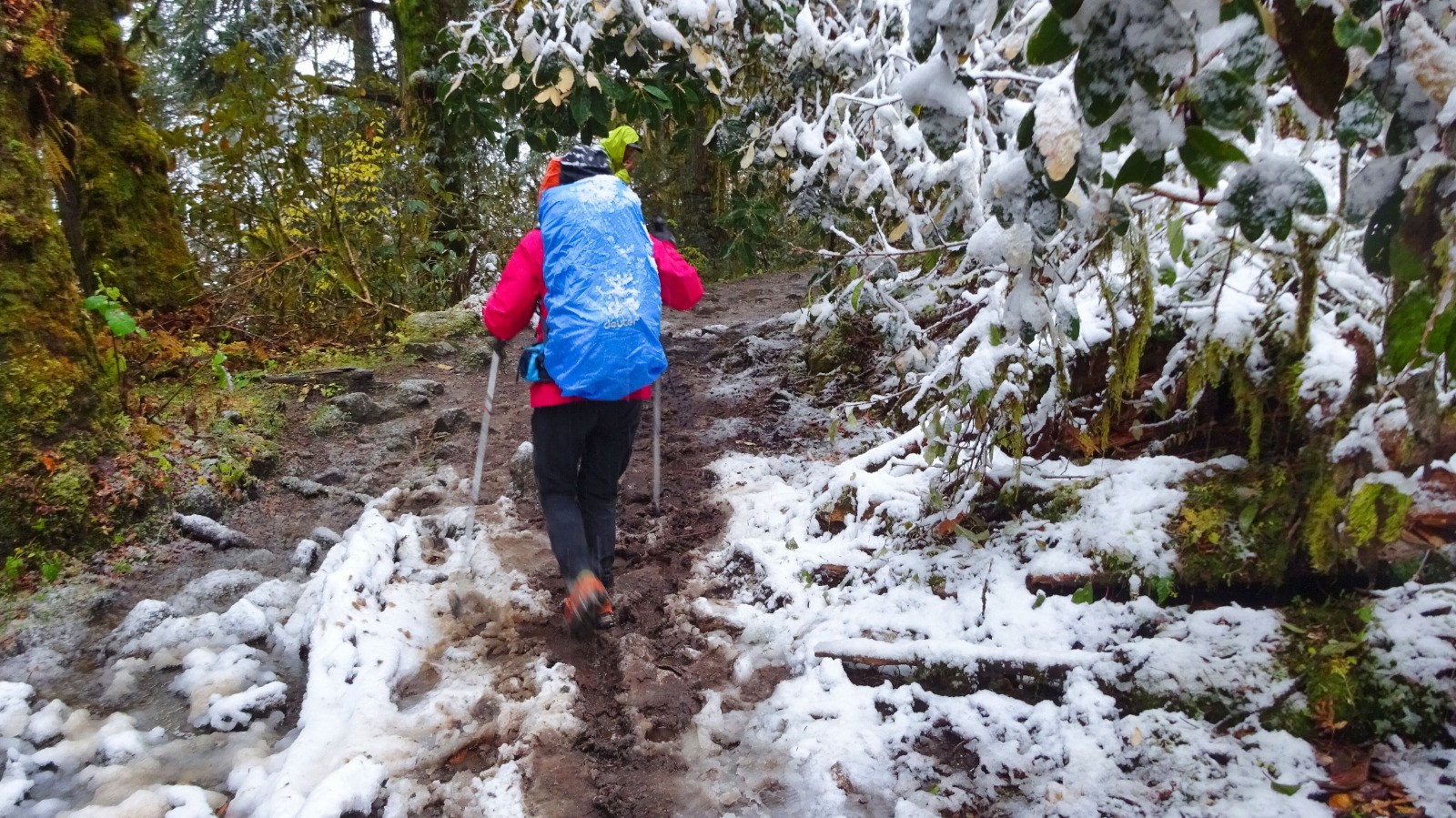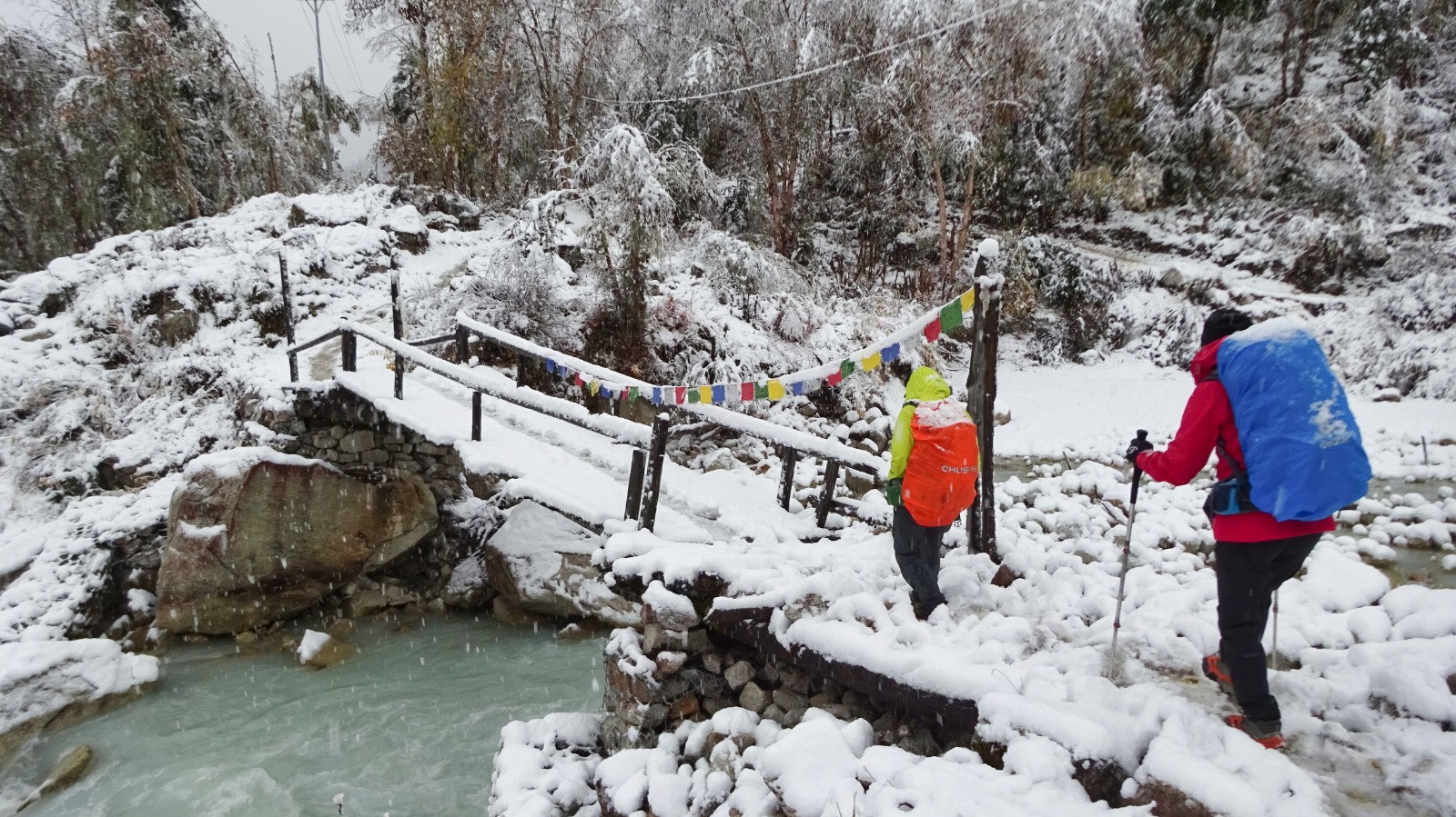 La neige se transforme en pluie, plus on perd de l'altitude plus le sentier se transforme en ruisseau et sur la fin on marche dans des mares boueuse, se sera comme cela jusqu'à la pause déjeuner (Surki Khola) ou tout le monde essais de se mettre à l'abri et de se réchauffer.
