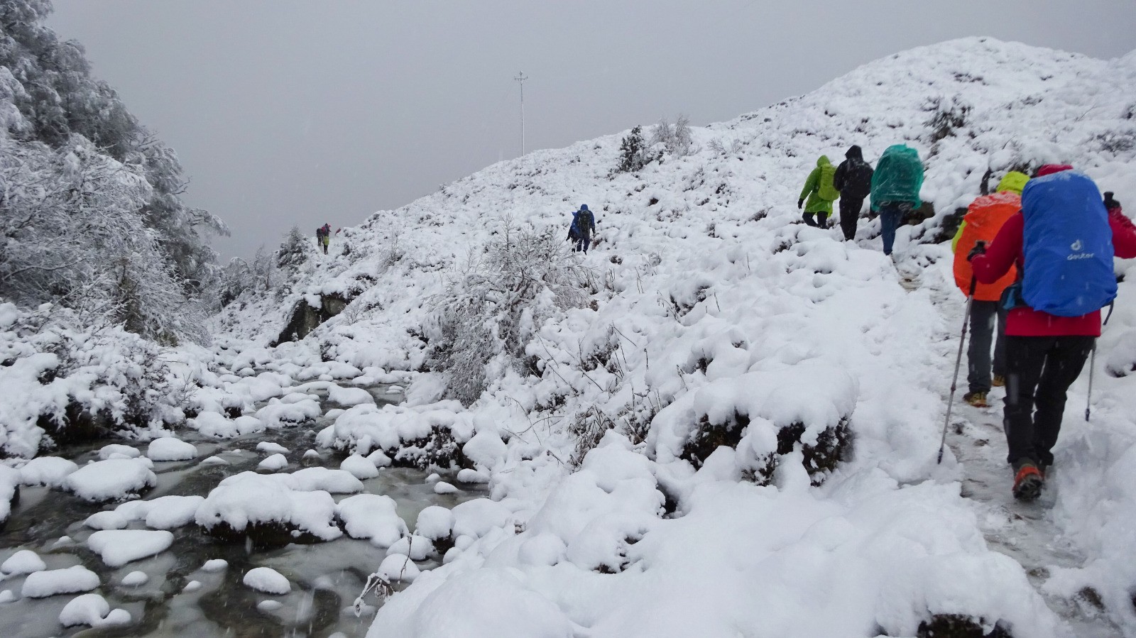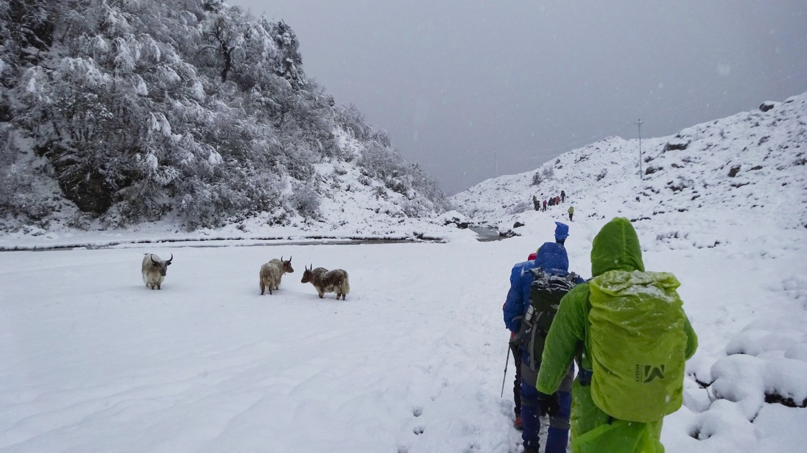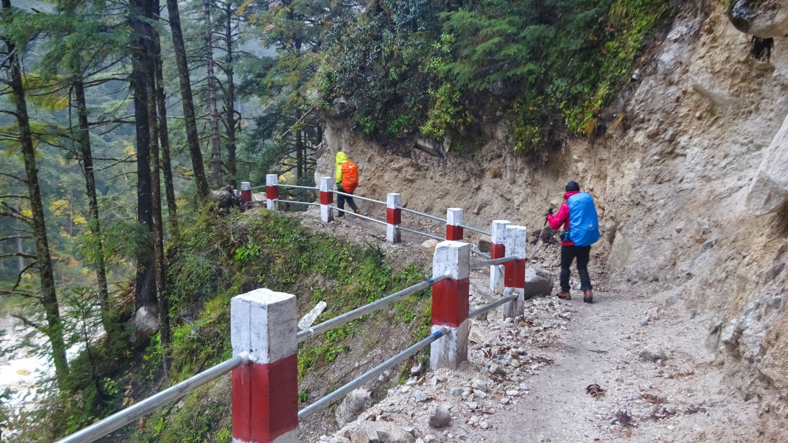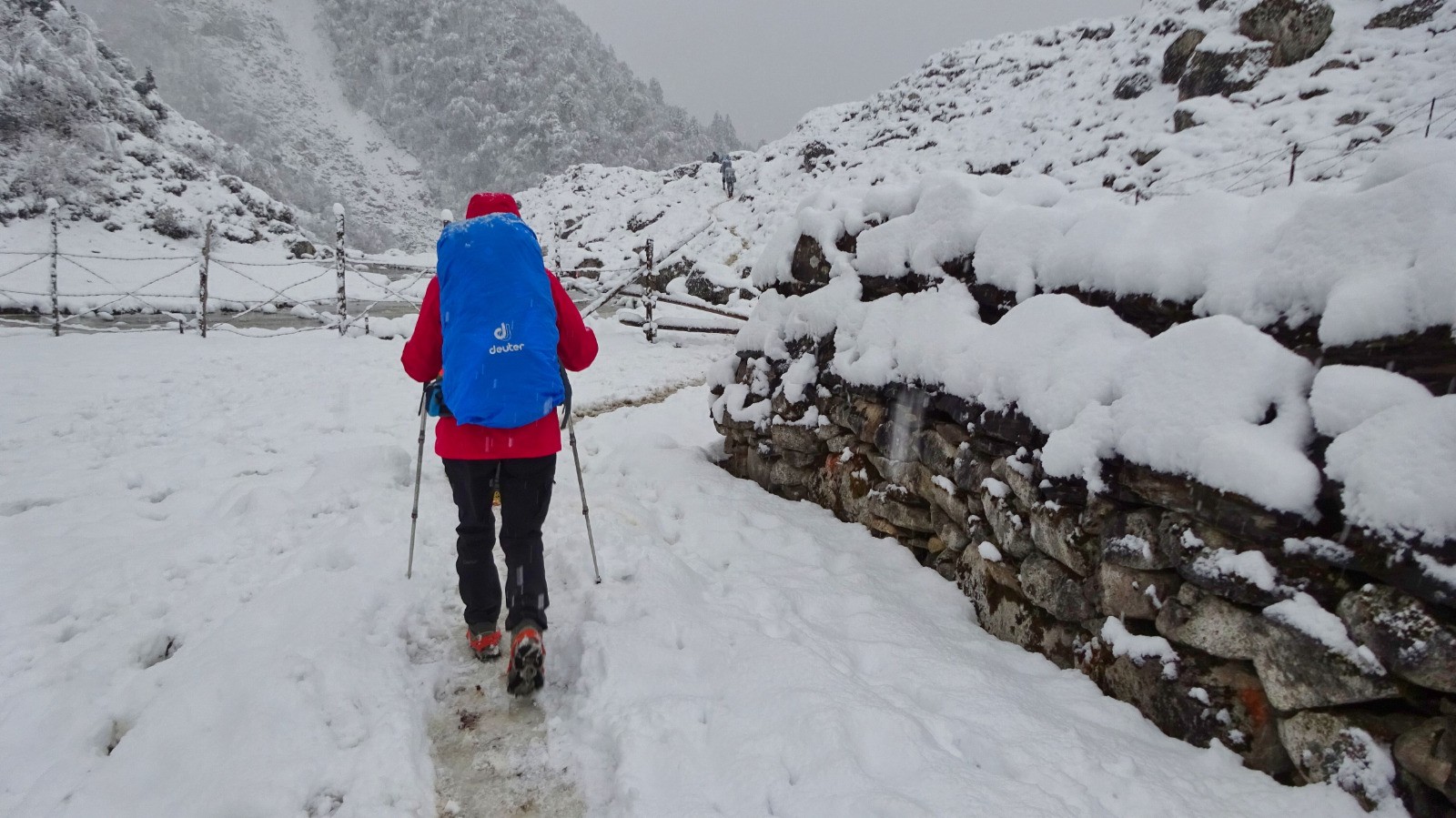 La neige se transforme en pluie, plus on perd de l'altitude plus le sentier se transforme en ruisseau et sur la fin on marche dans des mares boueuse, se sera comme cela jusqu'à la pause déjeuner (Surki Khola) ou tout le monde essais de se mettre à l'abri et de se réchauffer.