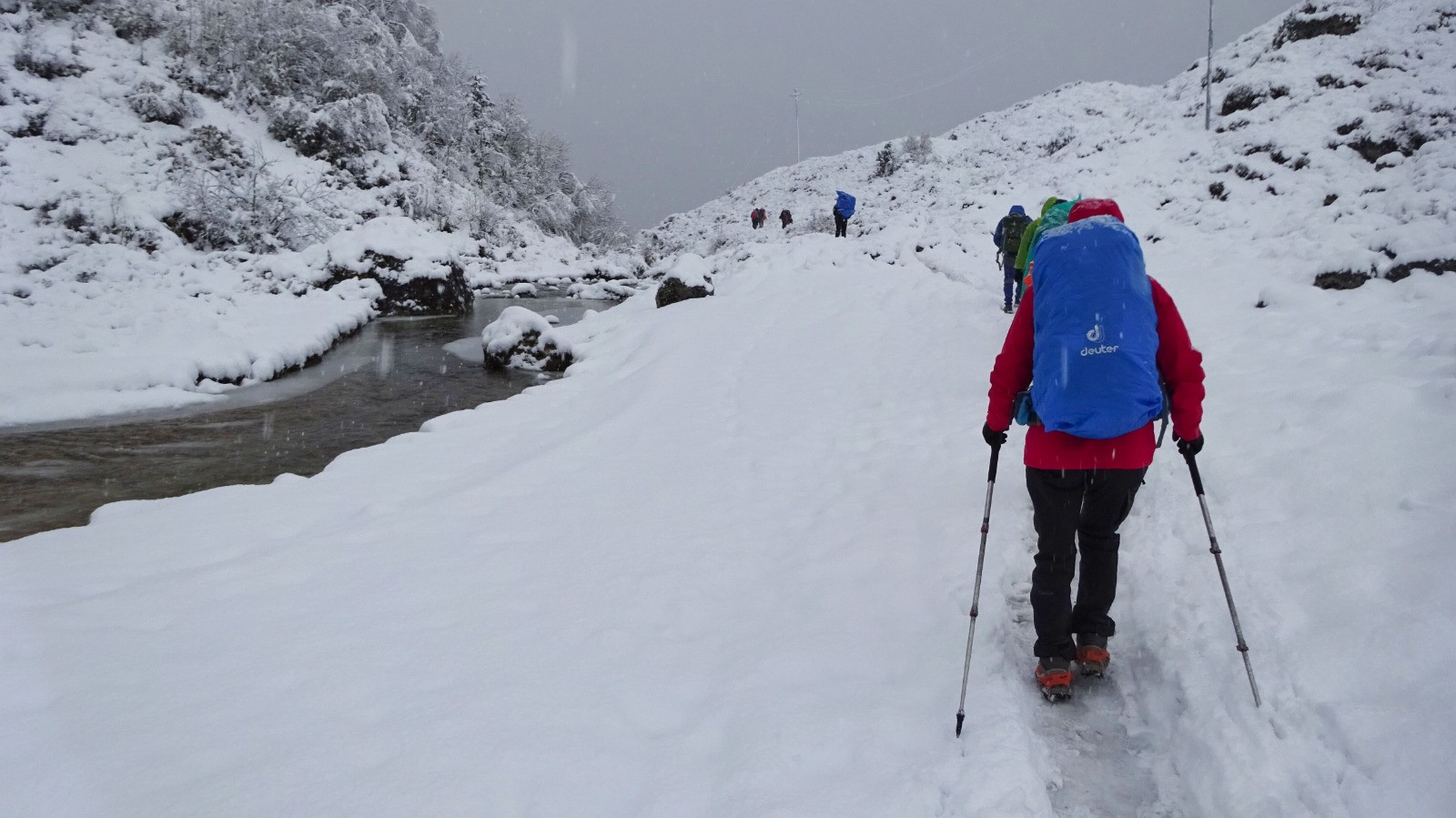 Le beau sentier descendant recouvert de poudreuse fait vite place à de la bouillasse, il faut bien choisir ses appuis pour ne pas glisser, heureusement que nous avons les chaînes à chaussures.