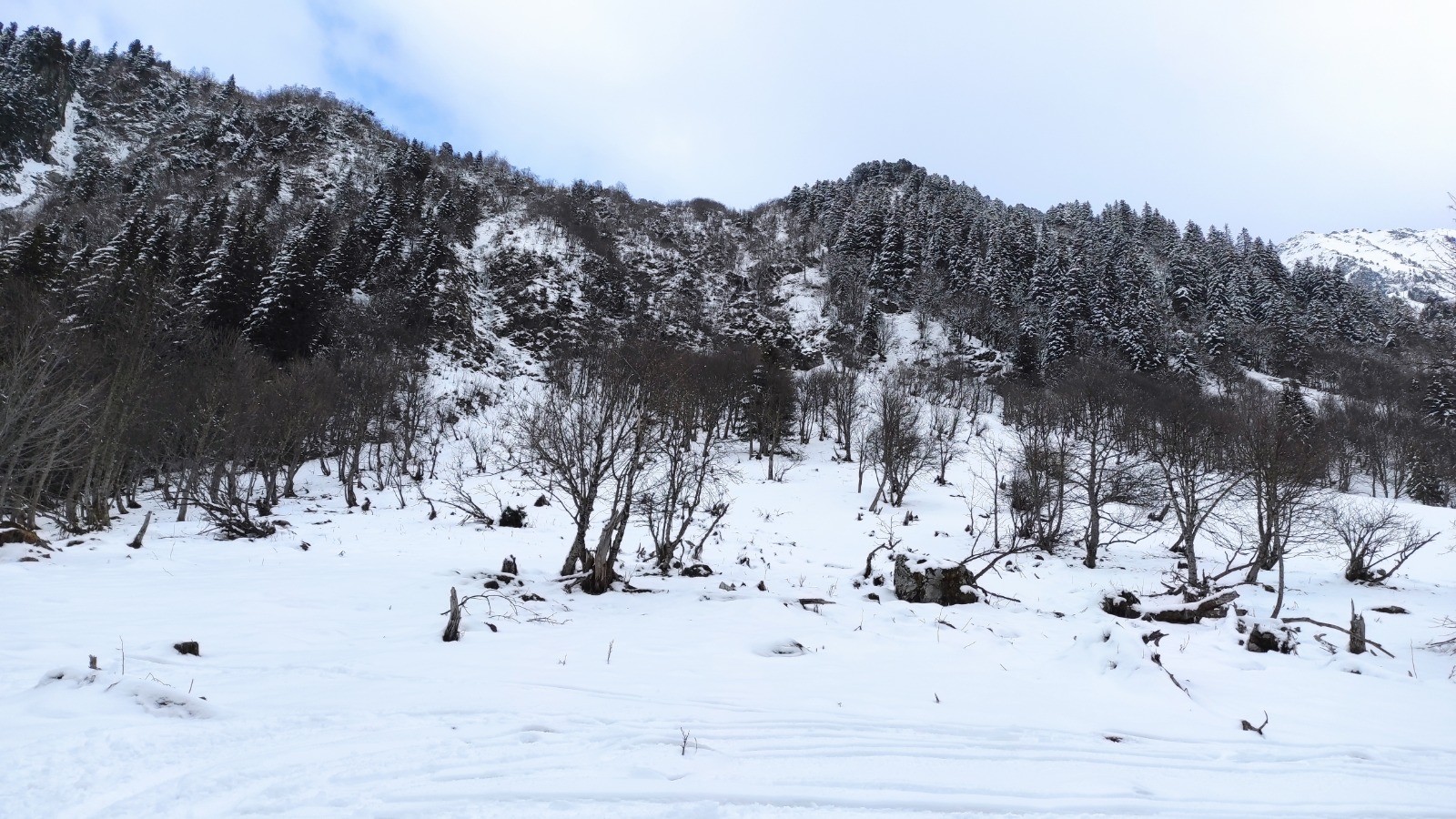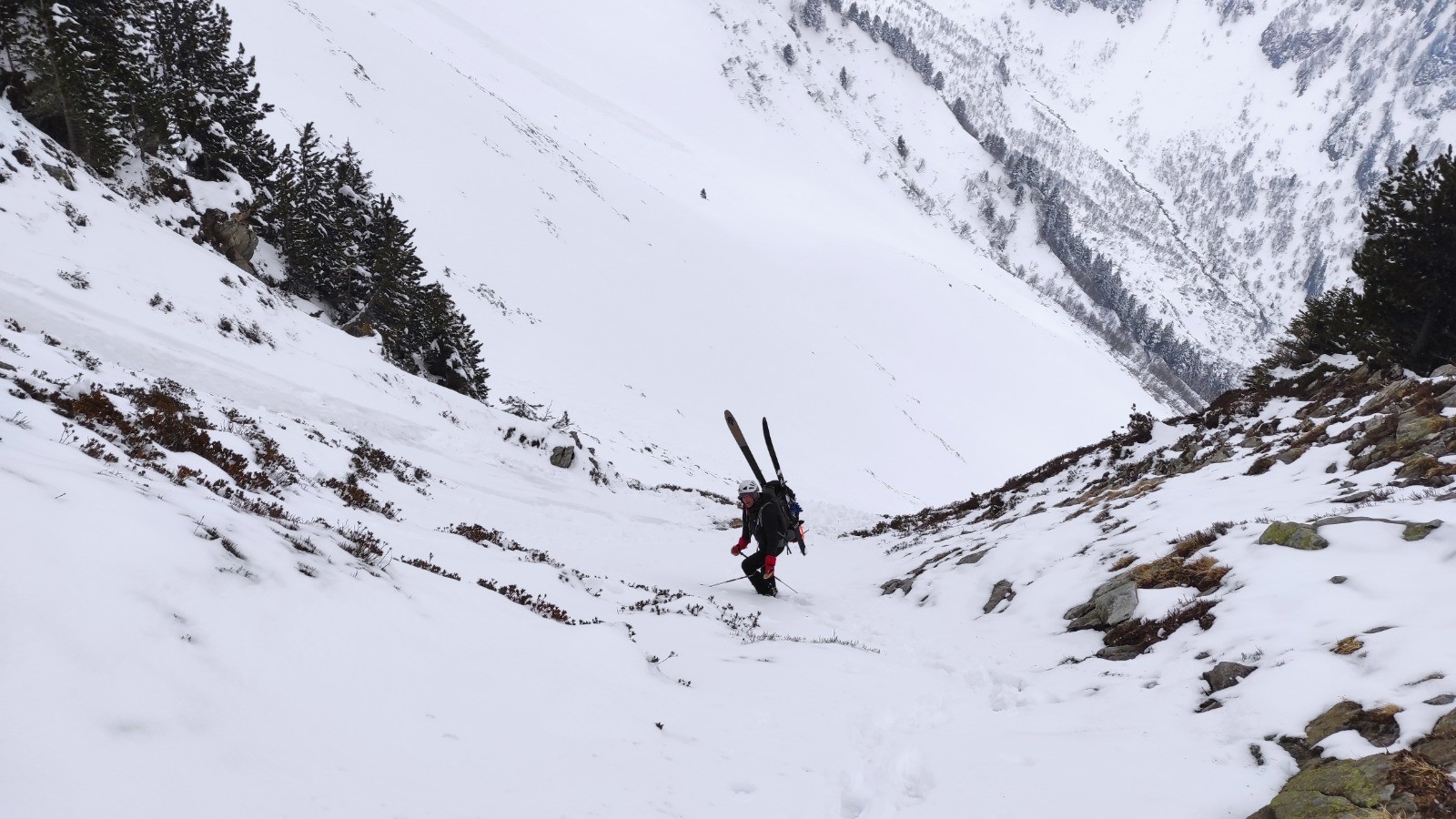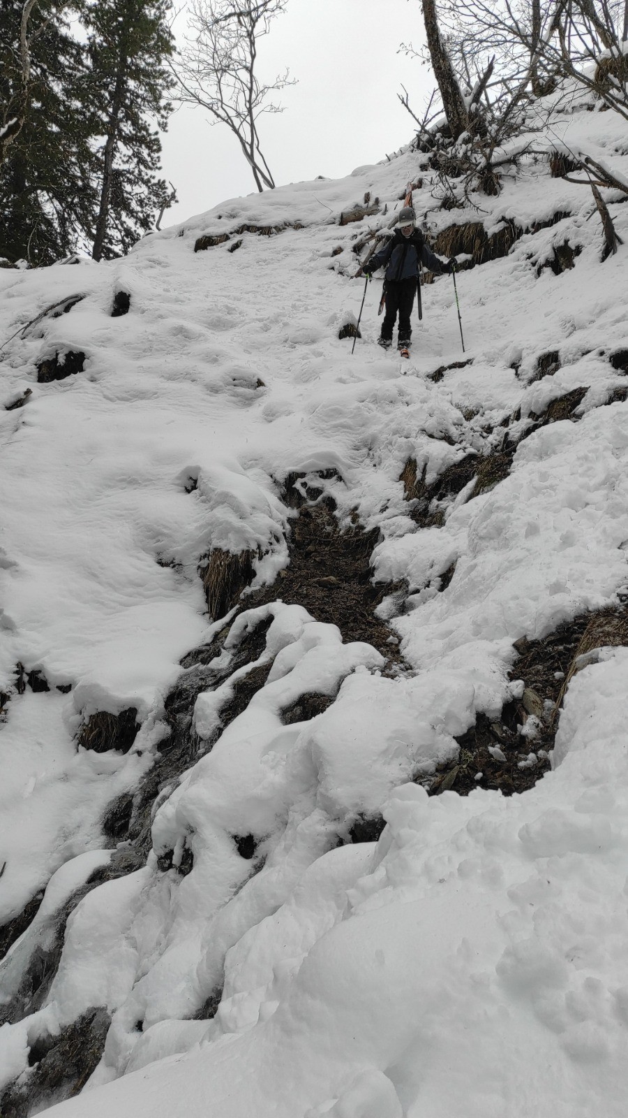 C'est pas simple. Deux suivent un goulet, avec Pat on tire dans les travers et arrivons en suivant des traces d'animaux au chalet, fermé, de Pré Nouveau. 1hr30 plus tard, Yves et Gérard, après avoir eu peur dans des goulets de glace, sont remontés, on trouvés nos traces et nous ont rejoints.