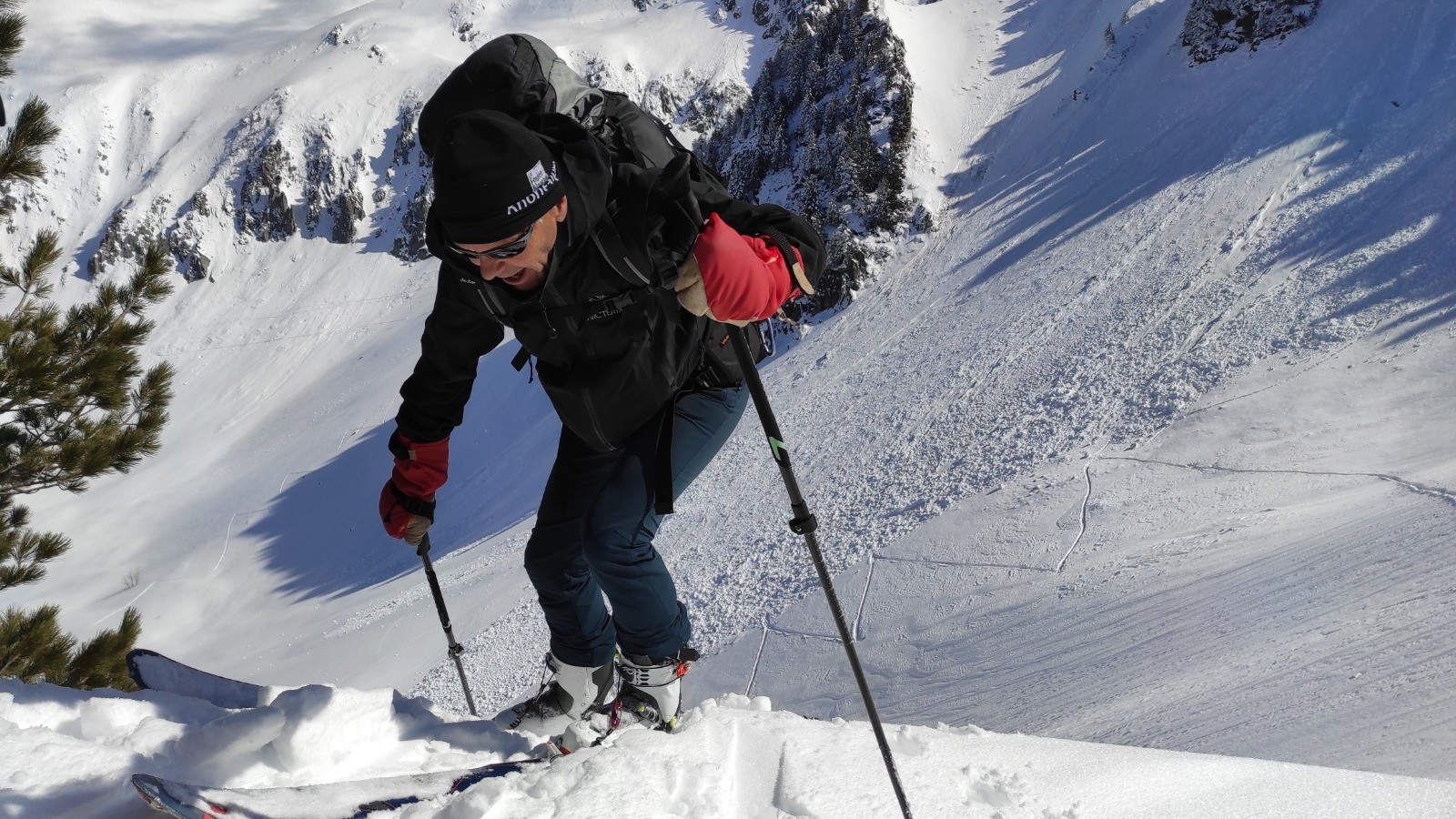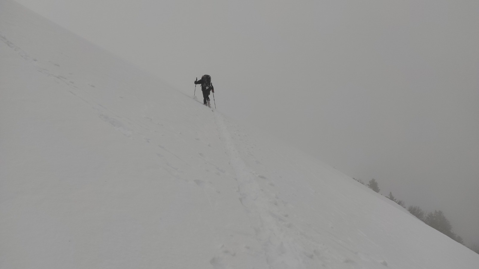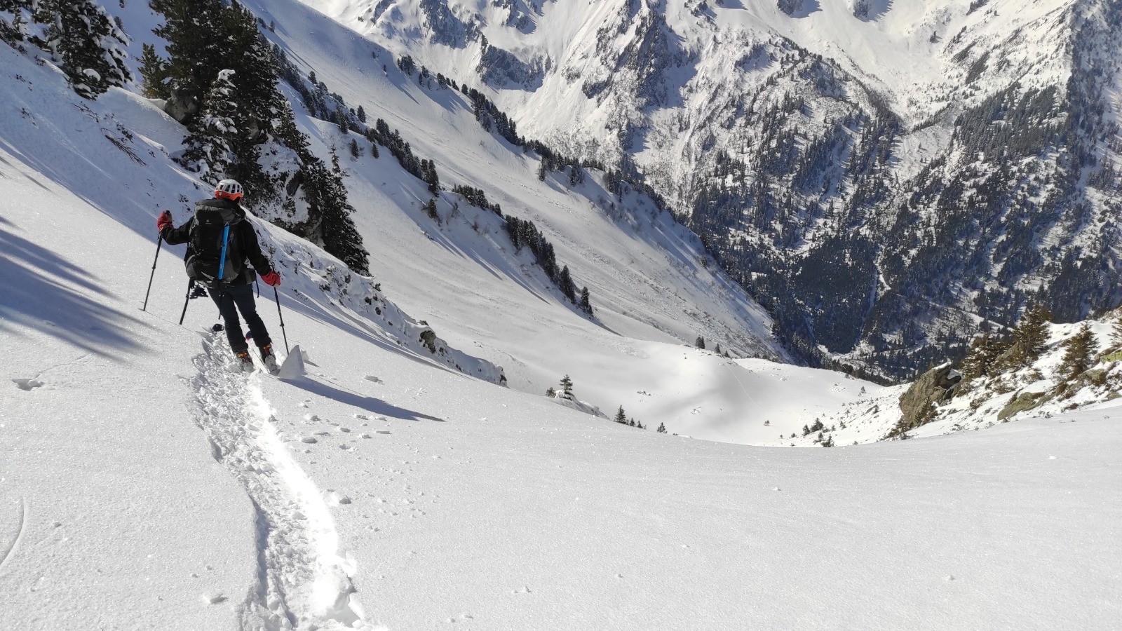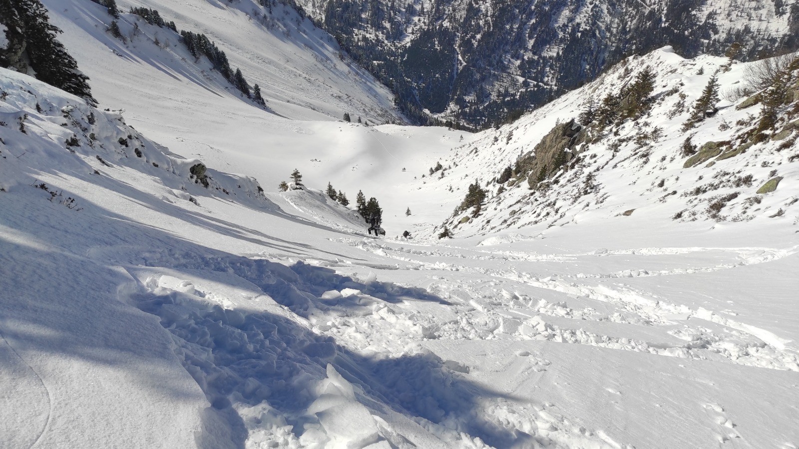 Contre toute attente, ce matin, nous décidons de repartir pour le refuge des Férices en passant par le chalet de la Perrière juste en dessous. Finalement, trois minutes, nous ne descendons pas mais reprenons nos traces de la veille jusqu'au lieu de notre séparation et suivons donc le cheminement que Patrick voulait prendre. Sur le GPS nous suivons un sentier d'été à mi-pente entre la pointe de la Frèche et le bas de la vallée. Nous le suivons un certain temps (je perds un couteau lors d'un crapahutage à pied) pour rejoindre le point haut du chemin au dessus de la combe noire. Nous continuons ce cheminement, pour rejoindre l'aplomb de la grande Lanche. Mais, à 10 mètre de rejoindre le chemin, en se basant sur le GPS, l'un de nous décide que c'est trop craignos et qu'il faut faire sauve qui peut. Trois options sont envisagées : continuer (véto par deux voix), retourner à la Perrière (véto), descendre au hasard dans les combes pour rejoindre un refuge en fond de vallée. Seule option sans véto, nous descendons donc avec une forte tensions dans le groupe.