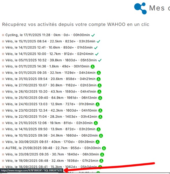 [49 posts] - Le 17/11/2025 12:01je confirme que même après connexion/déconnexion/connexion Visu<>compte wahoo, un clic sur les traces existantes dans la liste "Récupérez vos activités depuis votre compte WAHOO en un clic" génère une erreur SQL et incrémente le token jusqu'à la limite de 10 et blocage total manifeste.