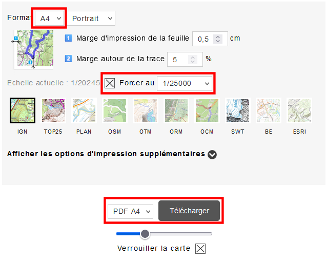 Une fois la trace télécharger, j'ai bien cocher la case "forcer au1/25000; malgré cela le carroyage ne correspondait pas à 4 cm = 1 km. J'ai dû décocher la case "verrouiller la carte" et avec le curseur augmenter jusqu'à obtenir un carroyage de 40 cm puis cocher "verrouiller la carte". A l'impression le carroyage n'était plus à l'échelle.