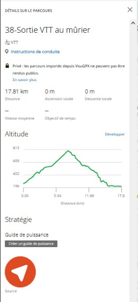 L'import du gpx VisuGPX corrigé, en re-permutant les 2 points, donne une activité complétement analysée par VisuGPX.