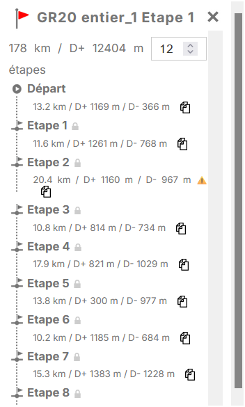 Si tu suis la trace globale avec toutes les étapes, tu as au choix la distance et le dénivelé de l'étape ou total, en cliquant sur le drapeau. Le profil est par contre celui le la trace complète, c'est une modification que je dois pousser pour n'afficher que l'étape.