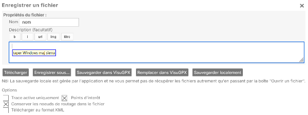 Lorsque vous affichez la fenêtre ci-dessous d'enregistrement du fichier, si vous effacez la description du fichier, celle-ci sera renseignée automatiquement lors de l'enregistrement ou du téléchargement par la description de la fiche visugpx.