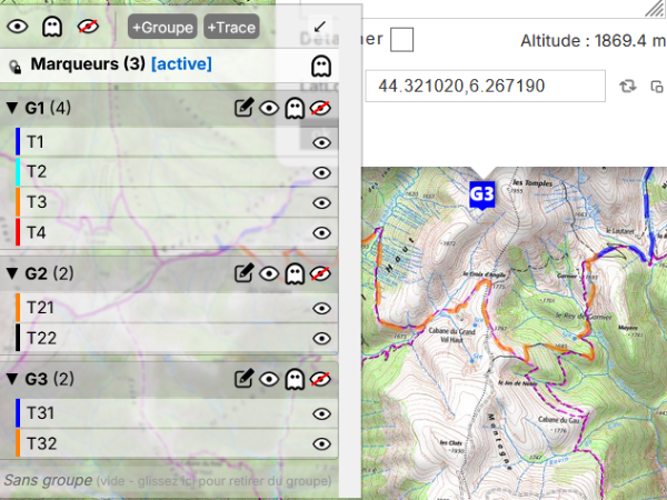 Je profite de ce message pour vous dire que j'utilise très fréquemment le mode d'affichage étendu des groupes et des traces, qui est extrêmement pratique entre autres lorsqu'on veut étudier plusieurs itinéraires possibles sur plusieurs jours à partir d'un même point de départ.