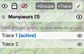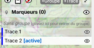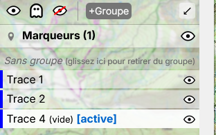 Je clique ensuite sur le bouton « trace » pour ajouter un troisième itinéraire, mais le logiciel me positionne sur la trace 1 (voir le message « trace 1 active ») au lieu d'ajouter une nouvelle trace :