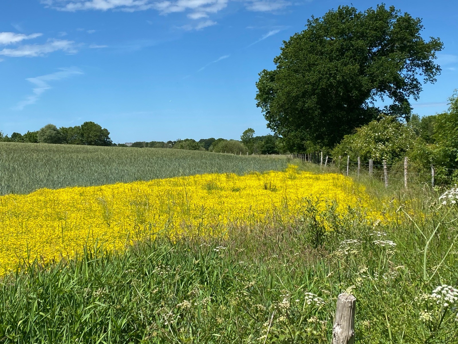 Bien suivre les flèches jaunes ou rouges "circuit VTT" avant de trouver un chemin herbeux longeant des cultures.