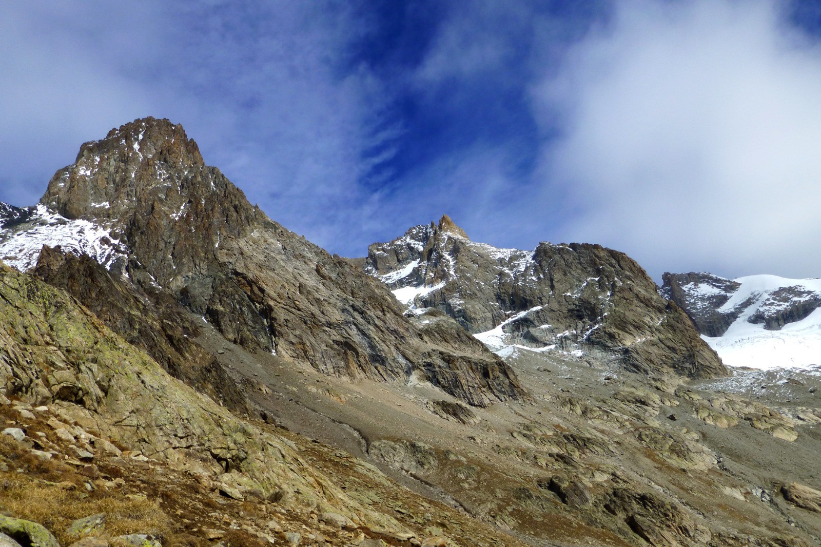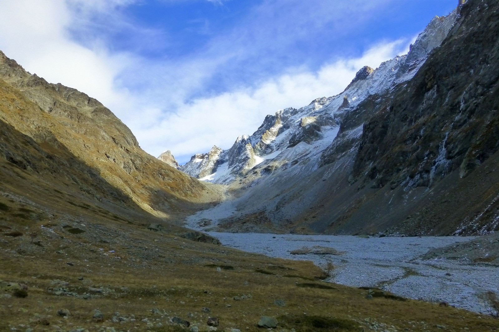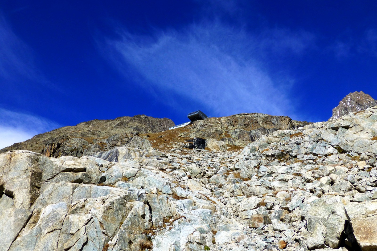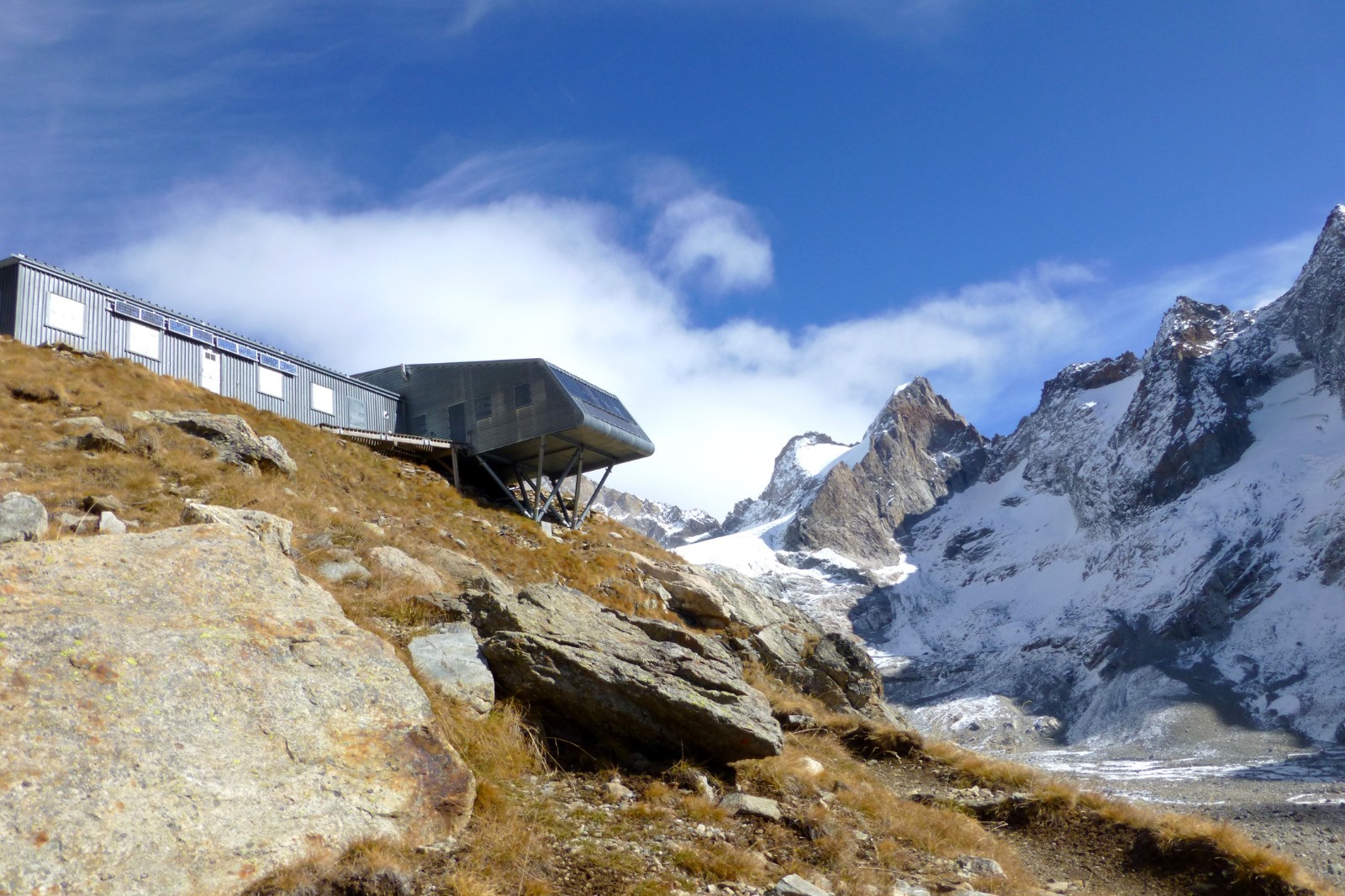 Le refuge, construit sur son éperon rocheux, vaut la longue marche d'approche : le site est spectaculaire, un immense cirque glaciaire dominé par de magnifiques sommets.