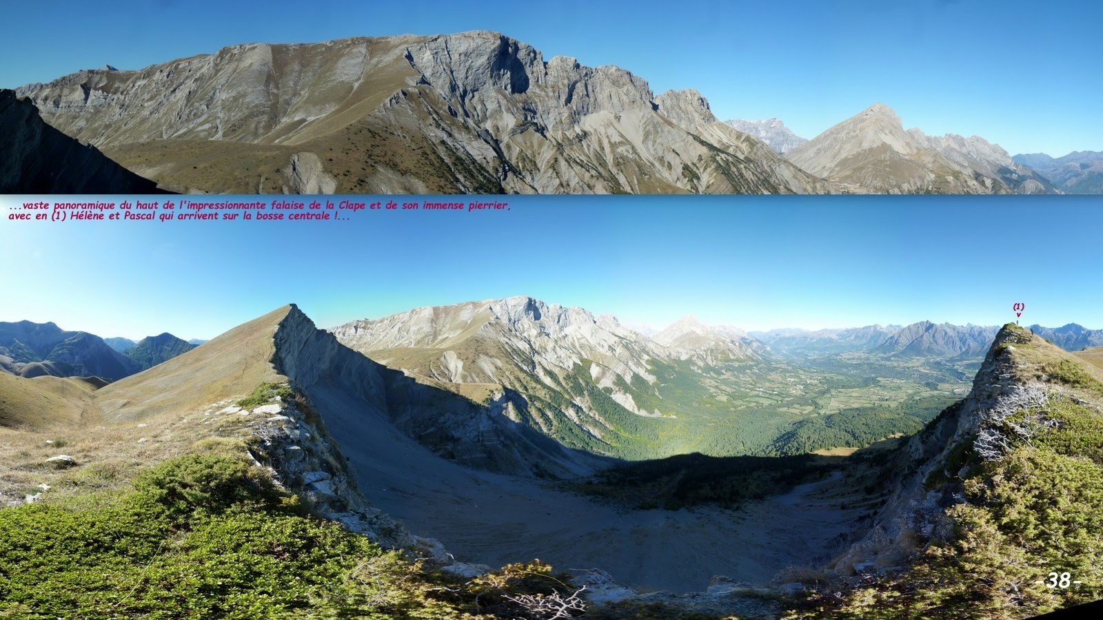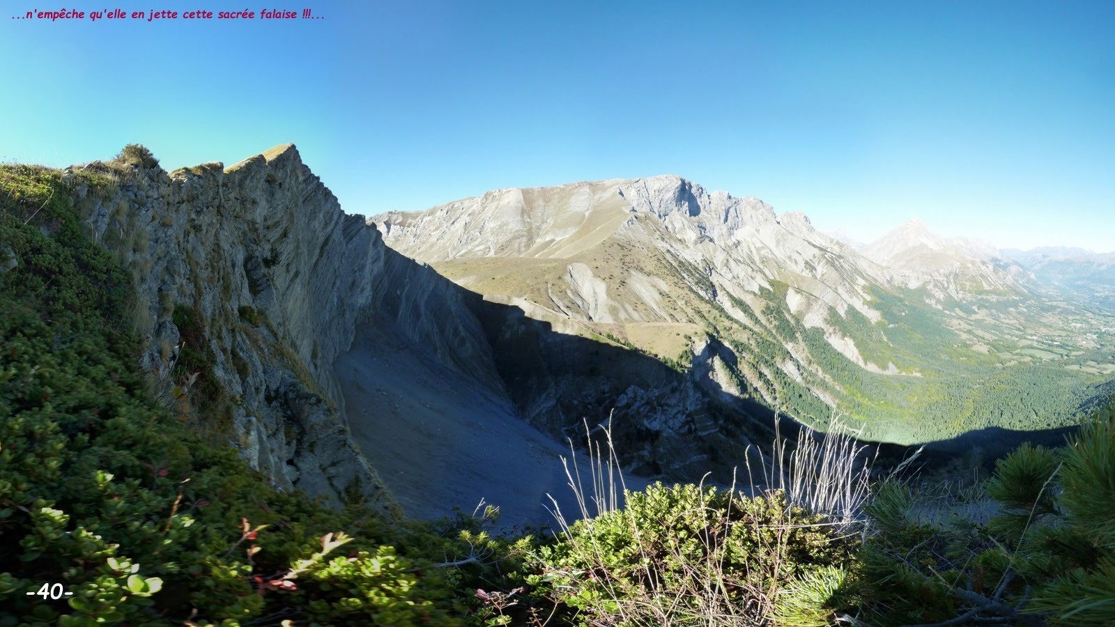 Il suffit d'observer d'en face les montagnes qui bordent à l'ouest le bocage du Champsaur sud pour s'apercevoir que du Pic de l'Aiguille, au sud, au sommet de Raz de Bec au nord il n'y a que la Montagne de Moutet capable d'héberger un alpage significatif, dès lors on comprend pourquoi nos anciens ont dépensé autant d'ingéniosité et d'énergie pour construire ces deux spectaculaires sentiers pour y accéder en toute sécurité. En toute logique, le Pas Neuf a du être construit le dernier, probablement pour pallier, déjà, aux difficultés de la traversée du ravin central. Ainsi, ils ont été les véritables précurseurs de notre notre soi-disant modernité, puisque cette partie du circuit de Bois-Vert n'est plus entretenue depuis déjà pas mal d'années. Très belle occasion pour inviter les plus véloces à boucler par la crête, ce que nous n'avons pas manqué de faire, avec en bonus l'aller-retour jusqu'au Sommet du Chamois avec depuis le Haut Col, le débonnaire Alpage de Chaudun au sud-est et la vertigineuse falaise abrupte, voire même surplombante, de la Clape au nord-ouest ; le tout constituant une bien belle randonnée au caractère bien trempé, que nous avons bien aimée.