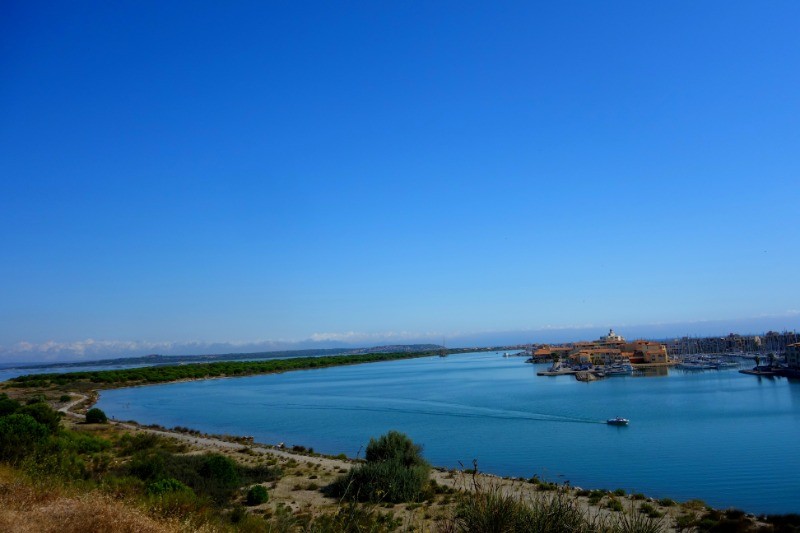 Le circuit passe ensuite à La Franqui, vue sur le site des Coussoules, base de char à voile et sports à voiles et de glisse.