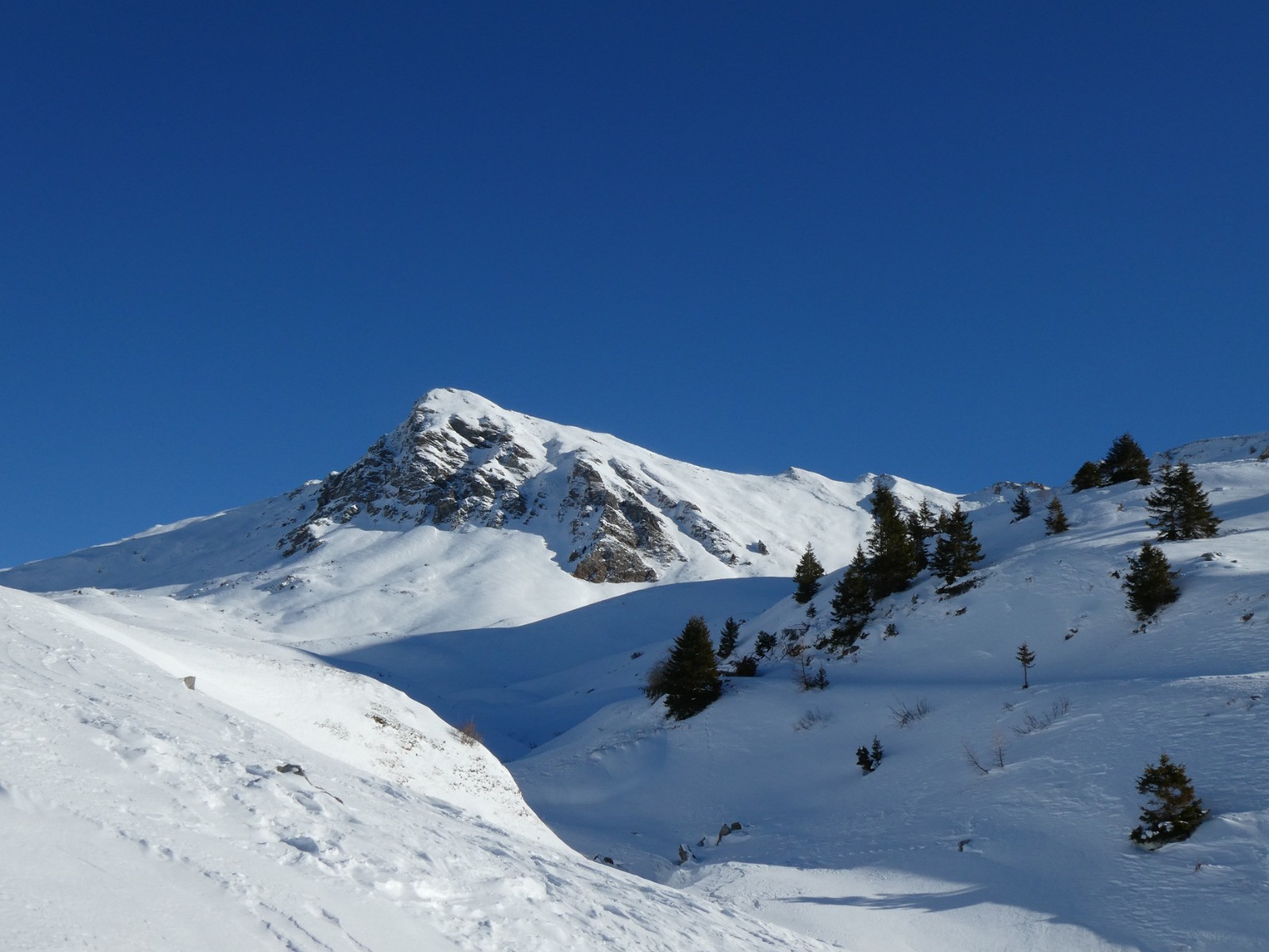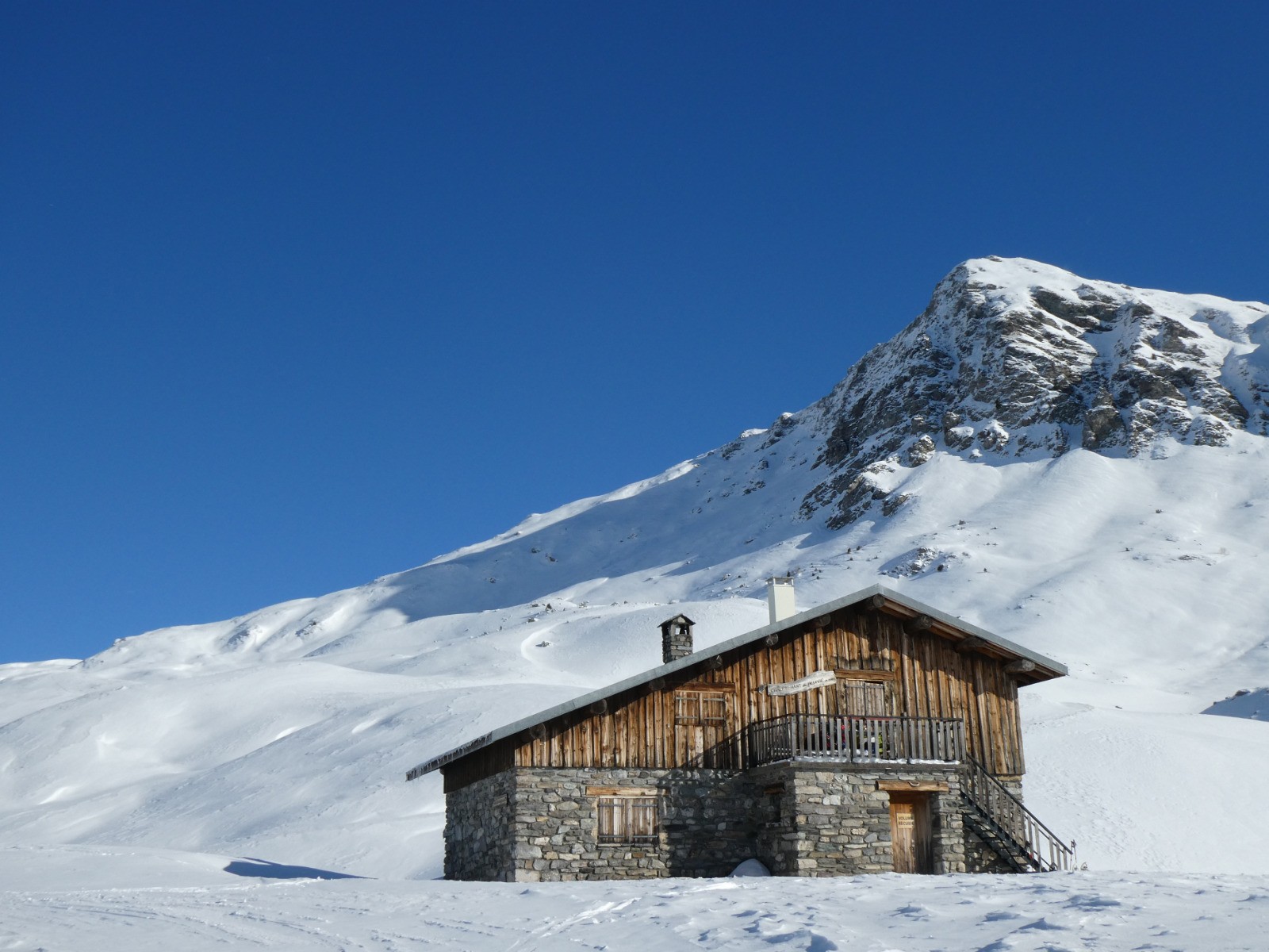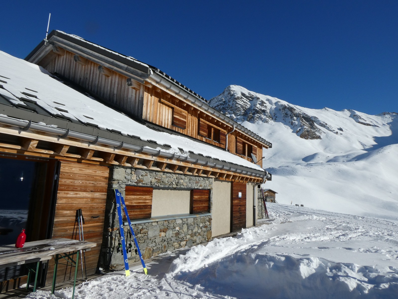Belle grande journée douce, enneigement peu abondant en dessous du refuge, on touche vite les cailloux.