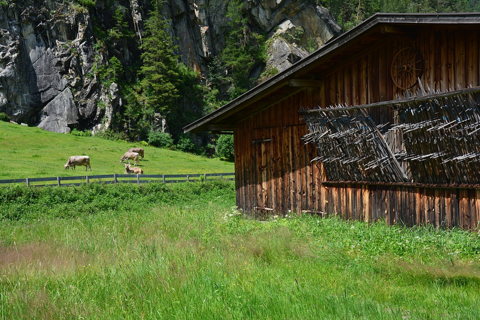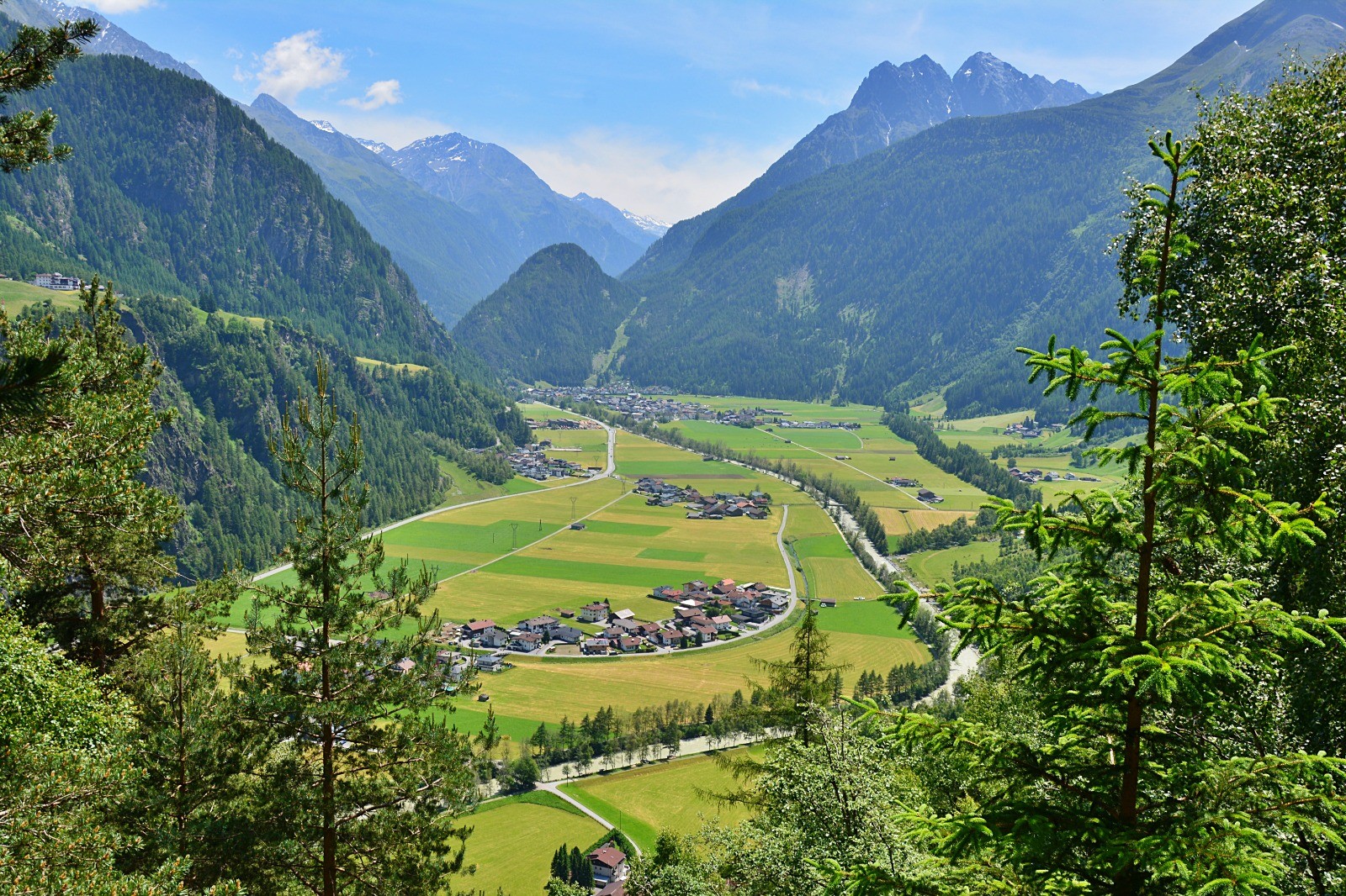 Depuis notre gîte à Au, montée à la cascade de Lehnbach, puis redescente en passant par le petit musée gratuit en plein air des métiers anciens de la vallée. Ensuite direction Langenfeld par la vallée et suivi du circuit panoramique Otztaler Urweg.