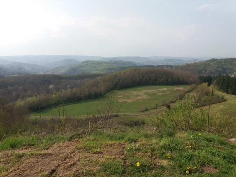 départ du parking du camping de cransac,,avenue de la gare,rue Anatole France,avenue des thermes,parking des thermes,direction hameau de la buenhe,la buenhe ensuite prendre a droite direction la montagne qui brule,contourner les bois de la vaysse,le rocher troué,la martinie,les thermes ,le camping