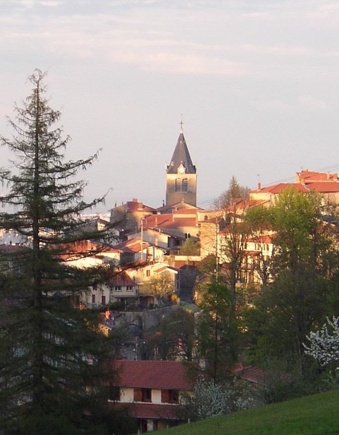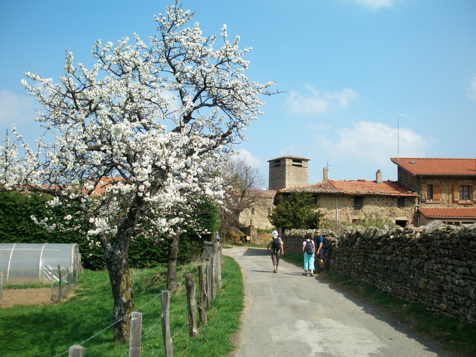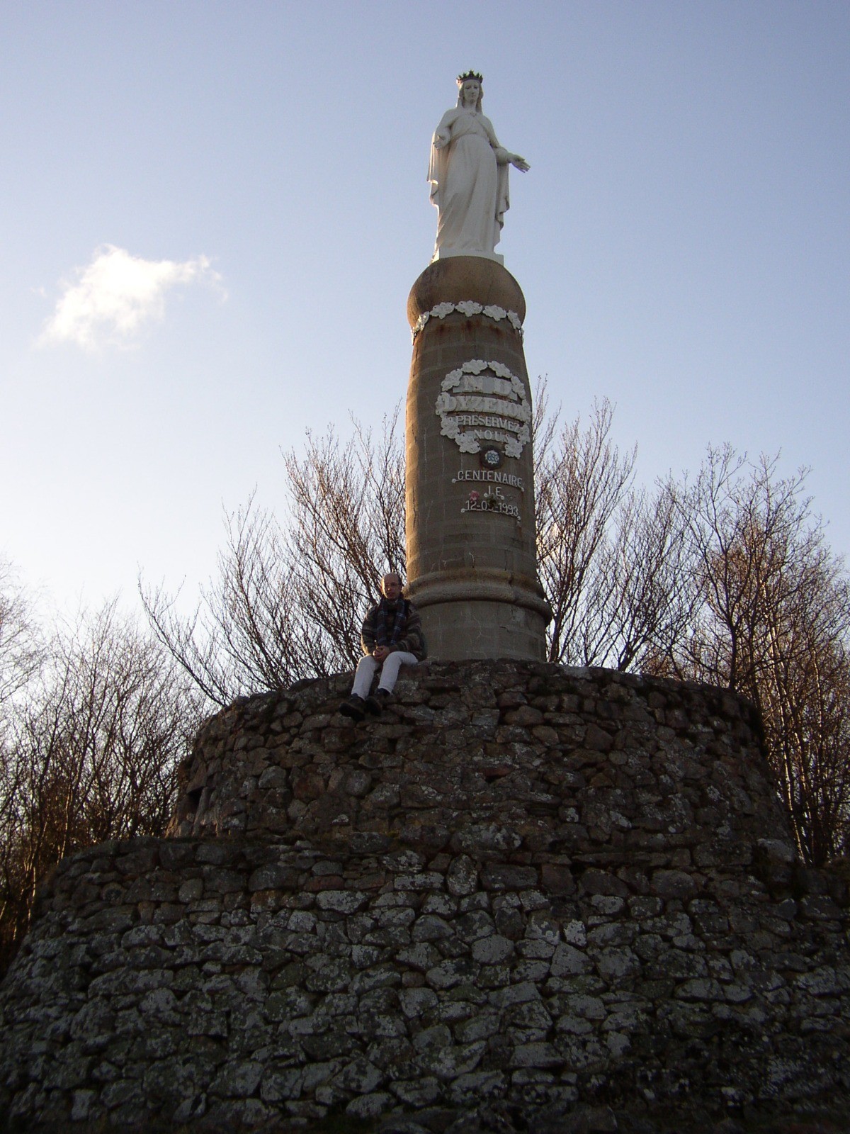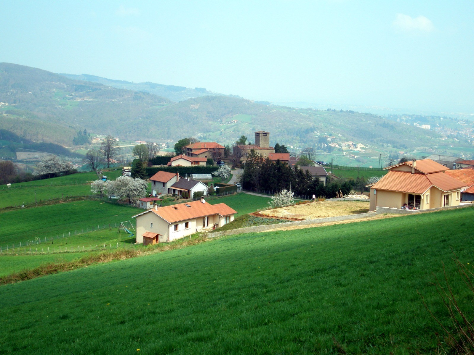 ST-LAURENT - LA MADONE : Après un replat, prenez la 2ème à droite, le chemin de Châteauvieu en montée puis suivez le chemin de randonnée jusqu'à Châteauvieux. A Yzeron, suivez O pour aller faire le tour du lac et pique-niquer si vous le voulez (eau, WC en rive nord), puis retournez au village pour passer sur la place du village (halle, eau, WC, commerces). A la sortie du village, en fond de vallon, traversez la D 489 pour monter en face par une rue. Tournez à gauche (et pas à droite sur le chemin de rando). Puis à droite en montée. Traversez la route des crêtes et prenez en face un chemin de randonnée montant en parallèle à la route puis N. Au Crêt de la Madonne, vous verrez le nouvel équipement du Fantasticâble, une tyrolienne géante et la madone historique.