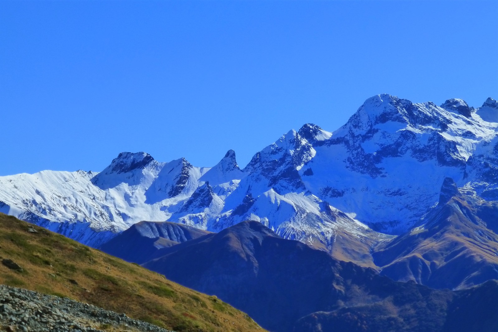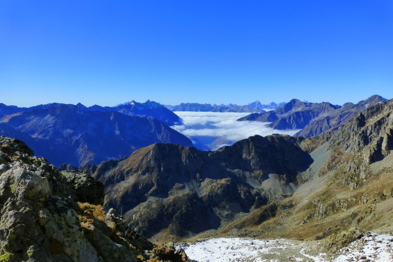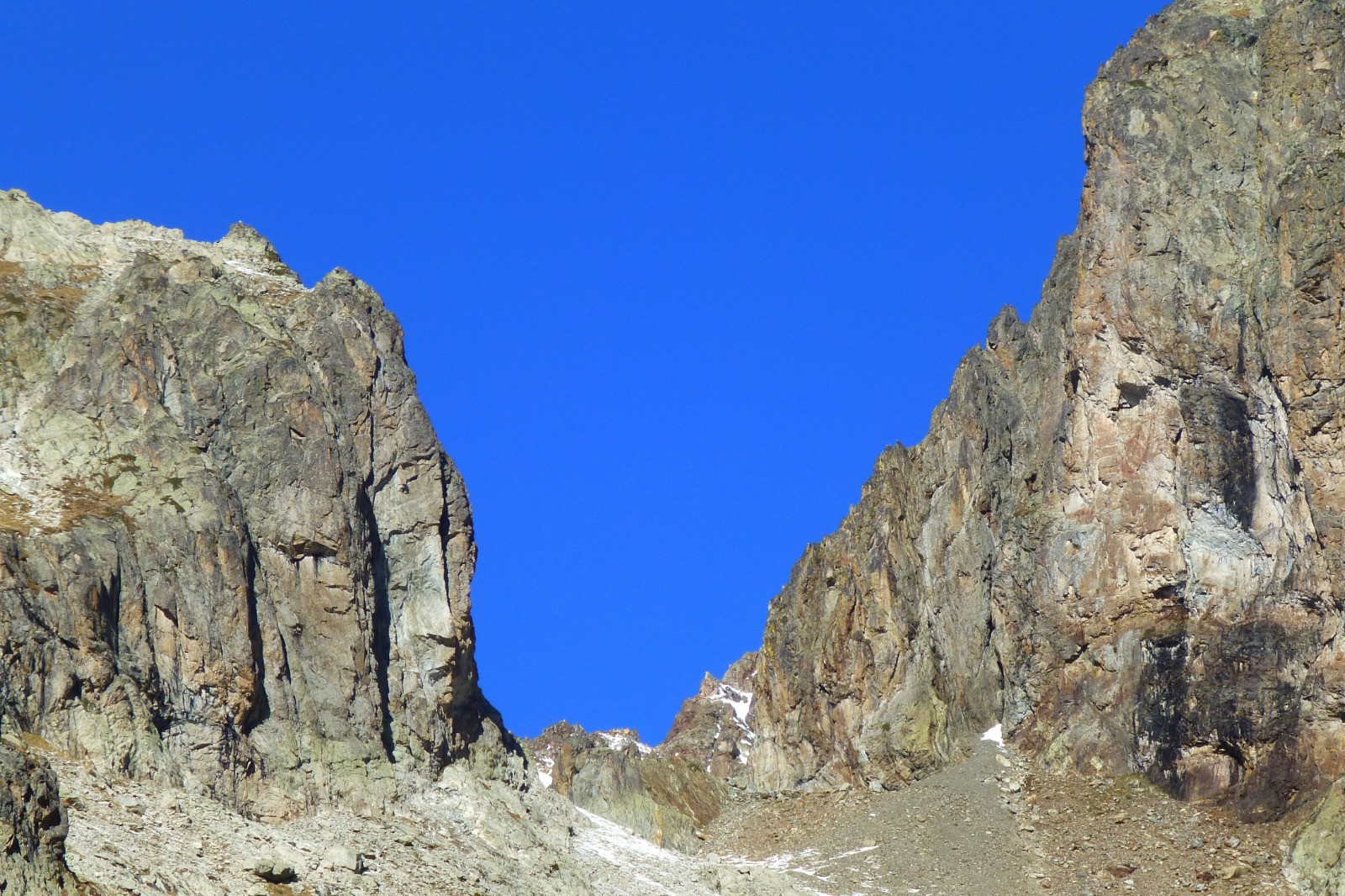 Passage étroit et spectaculaire au-dessus du refuge de l'Olan pour rejoindre la combe voisine. L'Olan, majestueux, domine.