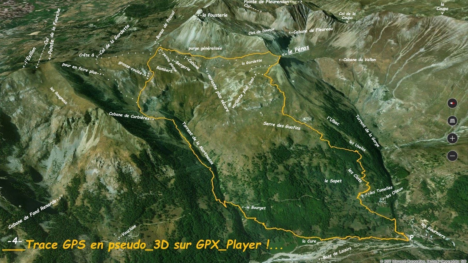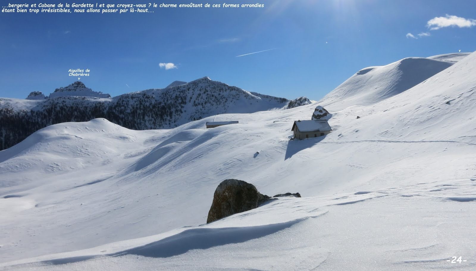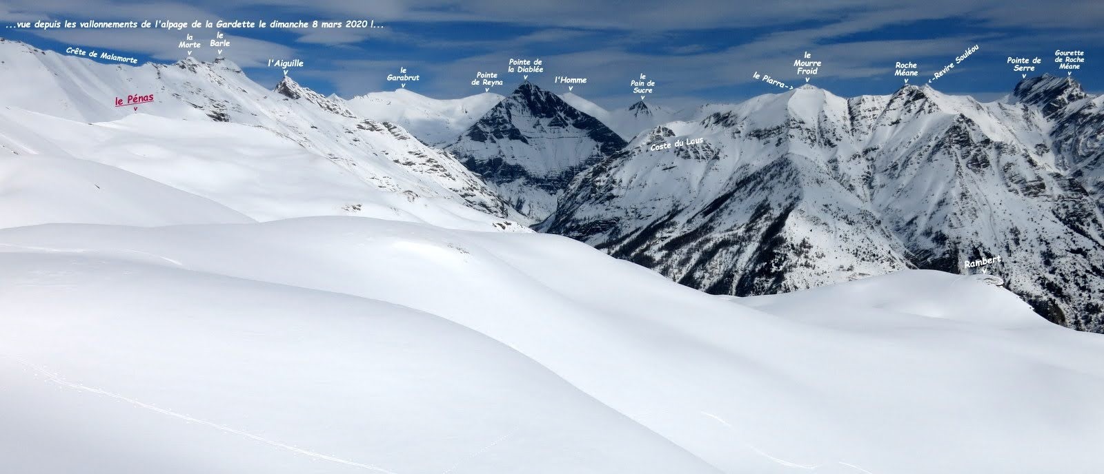 depuis le parking d'hiver des Gourniers > les Tomelles par le raccourci en rive droite du Torrent de la Gorge > montée directe par les Clots, puis la croupe Sud de l'Ubac en ayant l'antécime Sud-Est du Pénas en ligne de mire > arrivé au pied de la pente terminale d'accès à sa crête Sud, soit la contourner par une traversée jusqu'à la rive gauche du Ravin de Charence et revenir au-dessus, soit comme nous grimper directement droit dans la pente comprise entre 30 et 35° puisque colorée en jaune par l'IGN > le Pénas en traversée d'Est en Ouest jusqu'au collet coté 2247m, de là descendre en traversant au mieux la Gardette jusqu'à la Cabane homonyme (si les fortes pentes sous la crête Nord-Est de la Pousterle ne sont pas purgées et sont chargées descendre bien au-dessous de notre trace dans le très original chaos de gros blocs pour se mettre à l'abri de tout déclenchement à distance et éviter à tout prix de se faire prendre dans cette zone de compression par excellence) > de la Cabane il est possible d'allonger en remontant dans les vallonnements supérieurs, voire même de pousser jusqu'à la crête et par elle rallier le Col de la Gardette (attention son parcours n'est pas de tout repos, la preuve !), nous avons choisi un intéressant entre-deux en nous limitant au tour de Rambert en choisissant la descente de plus faible pente, toujours inférieure au seuil critique des 30° > le giratoire par la Cabane de Corbières pour terminer par l'excellente poudreuse en rive droite du Torrent de la Martinasse, jusqu'au GR 50 et GPR du Tour du Lac de Serre-Ponçon jusqu'à la piste de fond du Bourget qui facilite grandement le passage en rive gauche et permet de retourner au parking directement par le sentier du Bourget en passant en face de la Base de Loisirs de Réallon-les Gourniers, tout en respectant le damage des pistes de fond.