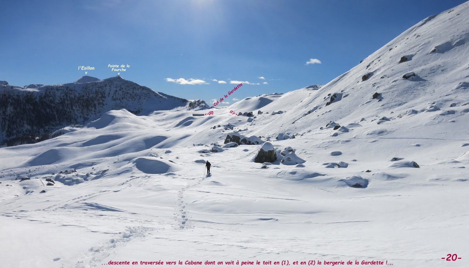 Après la Cabane de la Gardette, nous sommes légèrement remontés pour passer par la bosse supérieure ce qui a permis à Pascal de pousser jusqu'à la vue sur Jaillet et Pré du Clot côté Chorges du Col de la Gardette. En se décalant sur la très large congère pour choisir le meilleur talweg à descendre l'Ours a eu droit à un impressionnant boum suivi d'un affaissement de l'ensemble sans que rien d'autre ne bouge, la pente au-dessous n'étant pas suffisante pour le déclenchement d'une coulée, et à plus forte raison une avalanche ! Il n'en reste pas moins qu'en descendant nous avons constaté que la partie la plus raide de la dite-bosse avait subi une rupture de plaque de relativement faible épaisseur et de modeste envergure qui avait glissé sur une trentaine de m sans entraîner la sous-couche. Plus bas, au Sud de Rambert, le petit couloir le plus pentu était encombré par une coulée autrement plus importante suite à la rupture de la corniche terminale et bien qu'elle n'ait à aucun moment raclé jusqu'au fond le dépôt terminal sans zone de compression, était de l'ordre du 1,5m donc largement suffisante pour ensevelir l'imprudent qui aurait eu la mauvaise idée de descendre par là.