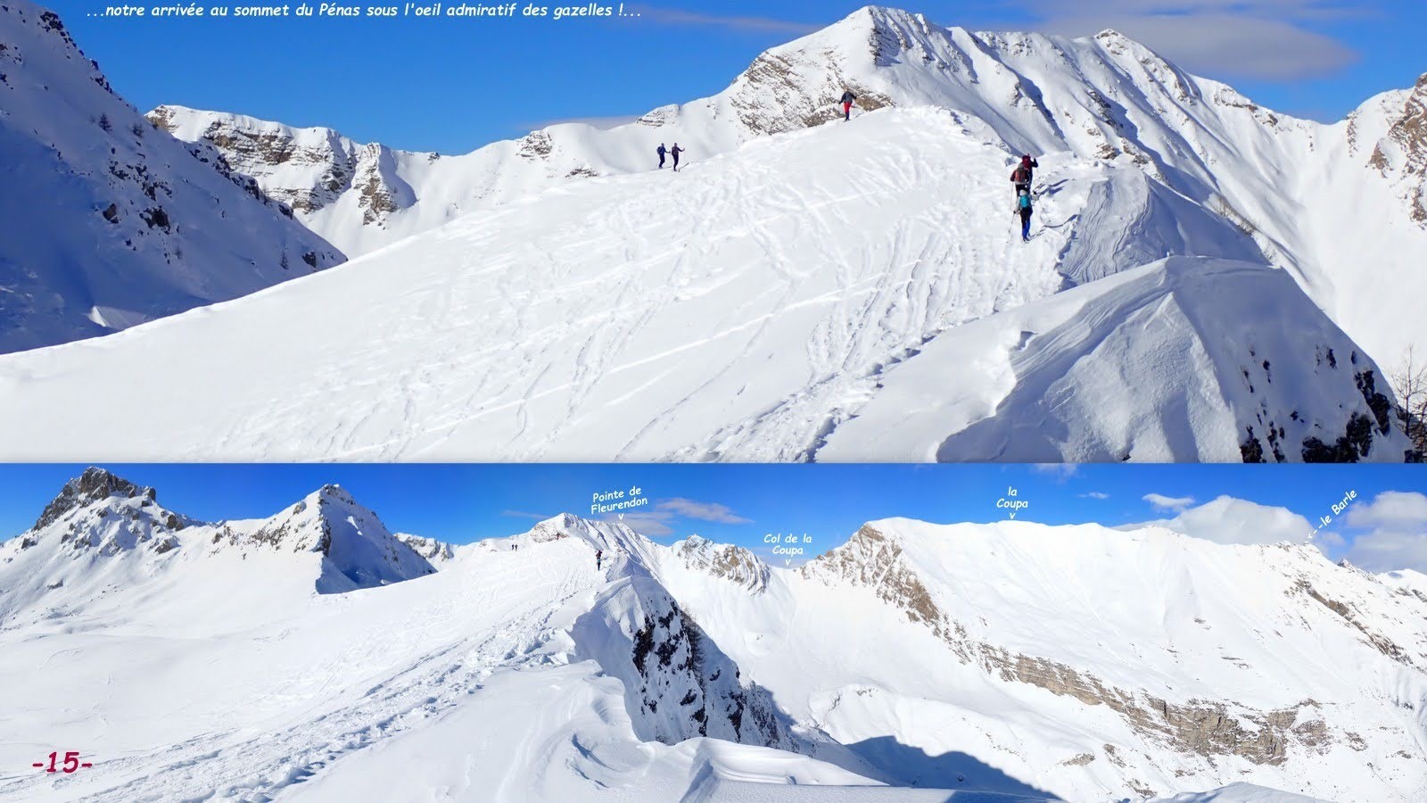 Le Pénas, 2271m, malgré cette altitude des plus modestes pour tout le secteur, de par l'élégance de sa pyramide sommitale au centre du fond de la vallée, fait qu'on ne voit que lui lorsqu'on rejoint Réallon par la route. Classique des classiques des skieurs de randonnée et autres surfeurs et raquettistes accessibles à tous, avec à peine 800m de dénivelé par sa VN depuis les Gourniers, 1470m, bon enfant et sans aucun risque si on ne s'égare pas dans des pentes plus raides, il est particulièrement fréquenté en hiver. Sa combe suspendue Nord-Ouest qui de son collet Sud-Ouest, 2247m, permet de rejoindre les itinéraires des Cols de la Coupa et de la Pousterle à la cote de 2000m, offre une descente de rêve dont il est dommage de se priver lorsqu'elle est en bonne condition. Mais pour cette randonnée de reprise pour nos ami(e)s Jocelyne et Patrice, presque un mois après notre dernière expédition commune à la Crête du Lauzet par son arête Nord-Ouest, l'Ours a préféré la jouer plus cool, tout en prévoyant quand même un large circuit de retour au-dessus de la Cabane et bergerie de la Gardette, un accès à la crête entre le Col homonyme et la Pousterle pour notre ami Pascal et une descente en faisant le tour de Rambert au plus court par un talweg bon enfant suivi d'une agréable traversée en giratoire jusqu'à la Cabane de Corbières pour revenir par l'excellente poudreuse en rive droite du Torrent de la Martinasse, jusqu'à la piste de fond du Bourget qui facilite grandement le passage en rive gauche et permet de retourner au parking par le sentier du Bourget en passant en face de la Base de Loisirs de Réallon-les Gourniers, dont il avait bien pris soin de ne pas en informer, lorsque nous avons convenu la veille de changer d'objectif à cause d'un vent tempêtueux de Nord, Nord-Est, avec des rafales entre 70 et 90 km/h, prévu par la Météo Montagne.