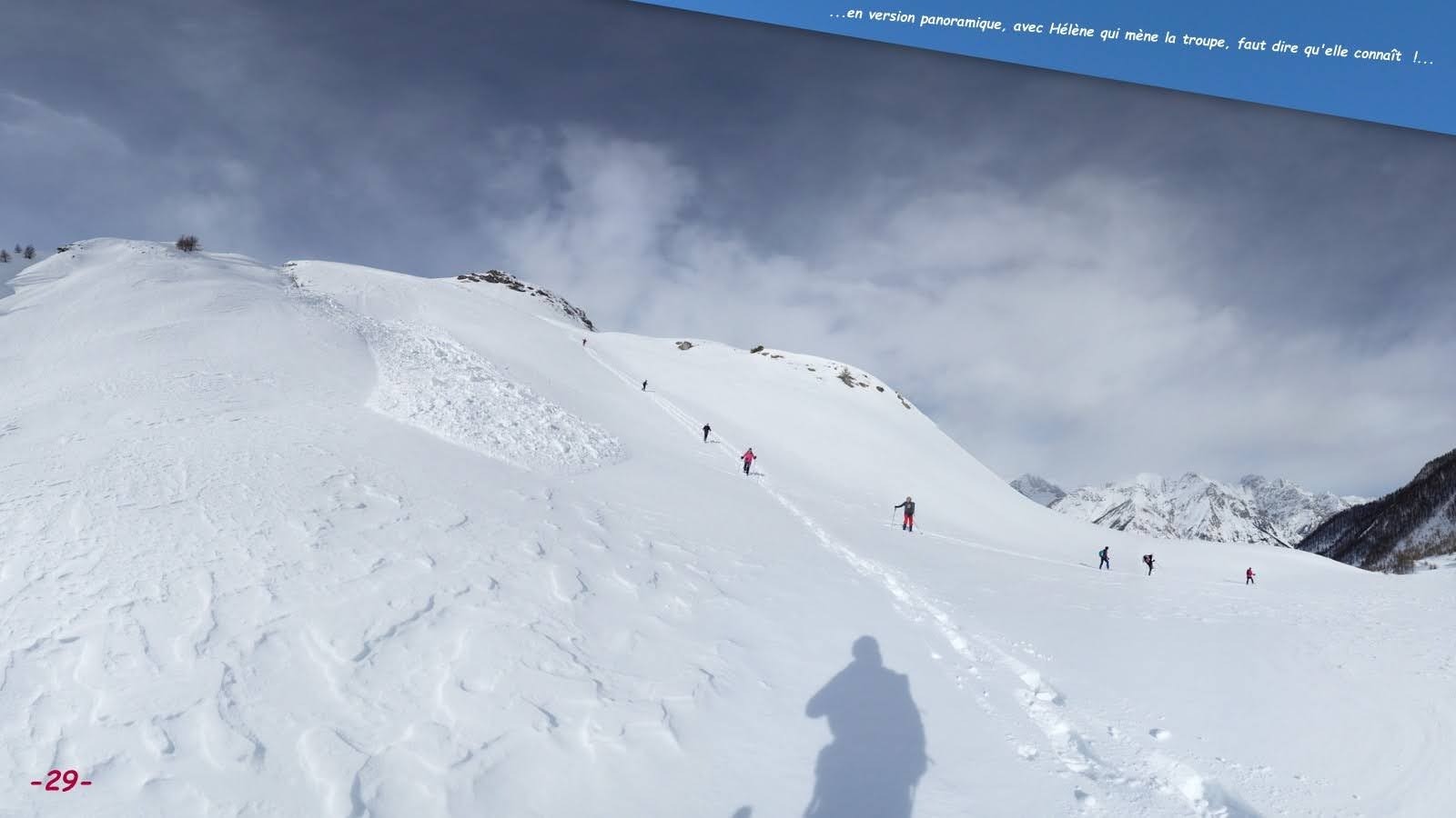 Dès le départ, nous avons profité de l'excellente trace des skieurs jusque vers 2000m où l'Ours a préféré tirer plus droit pour être un peu moins au vent et surtout éviter la portion la plus raide en dahu où il a vu deux skieurs de toute évidence pas très à l'aise dans leurs conversions. Par contre, la trace rejointe, il aurait été bien mieux inspiré de la suivre jusqu'à la rive gauche du Ravin de Charance au lieu d'inviter Pascal à tracer à flanc un Z en guise de raccourci pour rejoindre la crête sommitale au plus court. En effet, vu la piètre qualité des conditions de neige rencontrées, ce dernier a préféré grimper tout droit sur la croupe dans un alternat de neige dure, soufflée et quelques rochers et autres touffes d'herbe presque dénudés; résultat personne n'a aimé et les moins véloces y ont dépensé beaucoup trop de leur précieuse énergie, dommage, et un mauvais point pour l'Ours ! ensuite, nous sommes forcés de reconnaître que l'arrivée au sommet du Pénas par sa somptueuse crête Sud-Est est des plus spectaculaires, dommage que la violence du vent ait un peu gâché la fête, la descente par sa crête Sud-Ouest jusqu'au collet coté 2247m est tout aussi splendide et alors que dire de la traversée de l'alpage de la Gardette ?! un véritable régal autant pour les yeux que le ressenti physique en pleine immersion dans cette succession de vallonnements d'une singulière originalité dont il est primordial de ne pas s'enivrer au point de perdre toute vigilance par rapport aux fortes pentes Nord-Est de la Pousterle assez avalancheuses, même si elles ont pour caractéristique de se purger assez régulièrement grâce à la chute de boules de neige qui tombent des parties rocheuses qui la surplombent, véritable "Gazex" 100% naturel; en cas de doute, il est vivement recommandé de traverser bien au-dessous de notre trace, cas d'école pour un déclenchement à distance meurtrier; ayant bénéficié d'une purge généralisée antérieure, nous sommes passés sans la moindre hésitation.