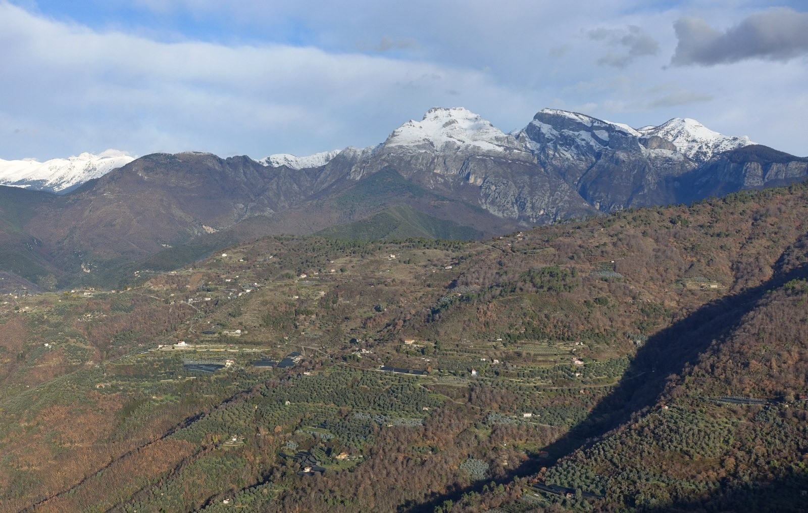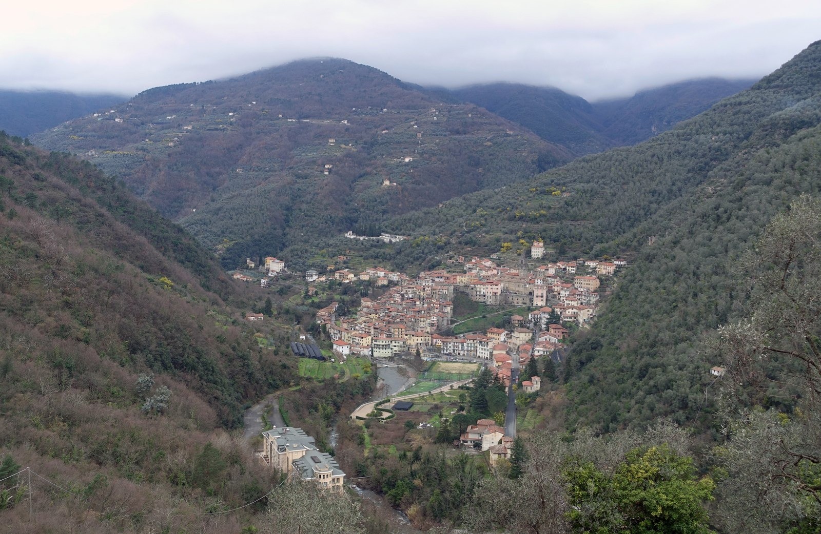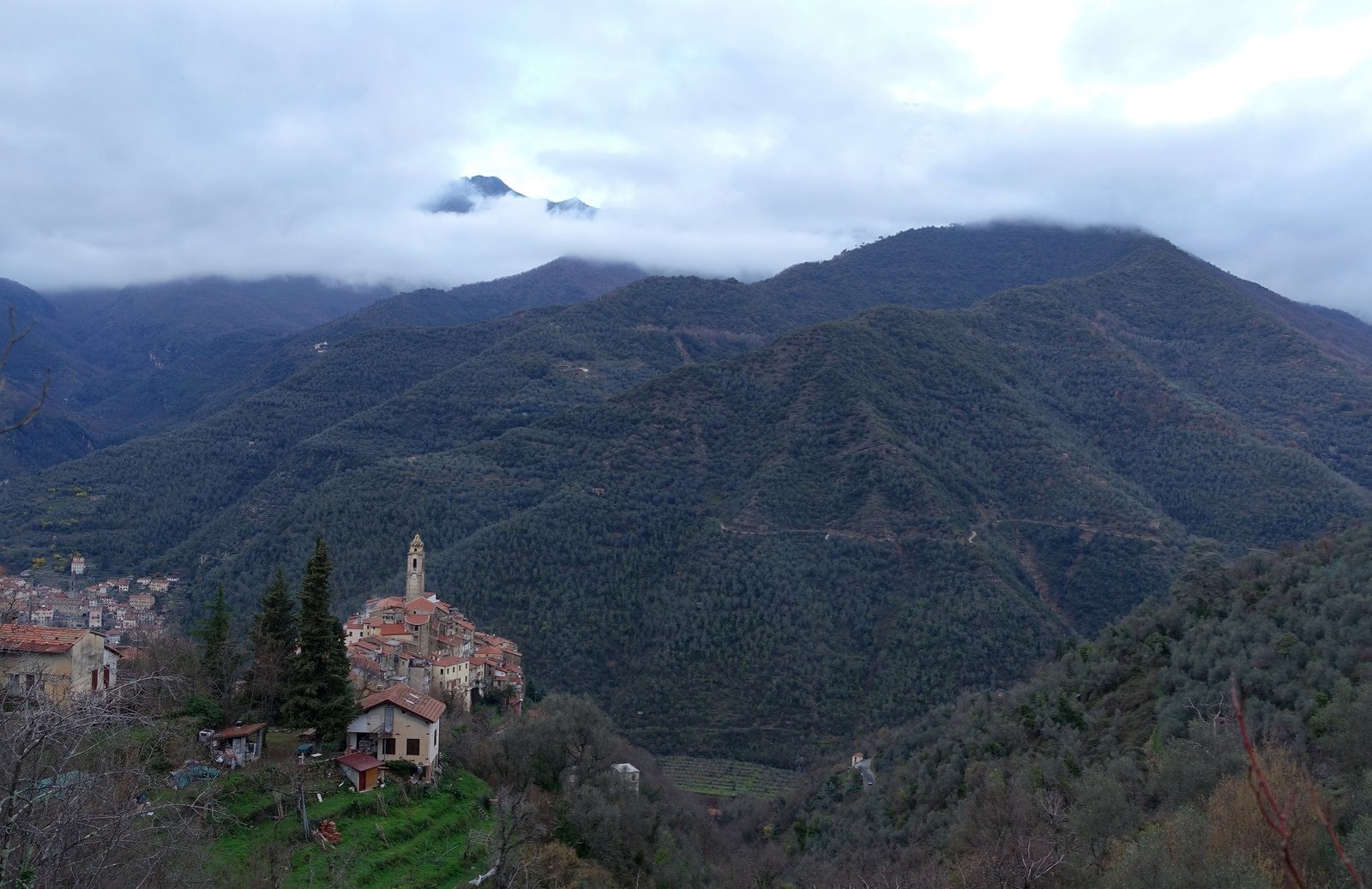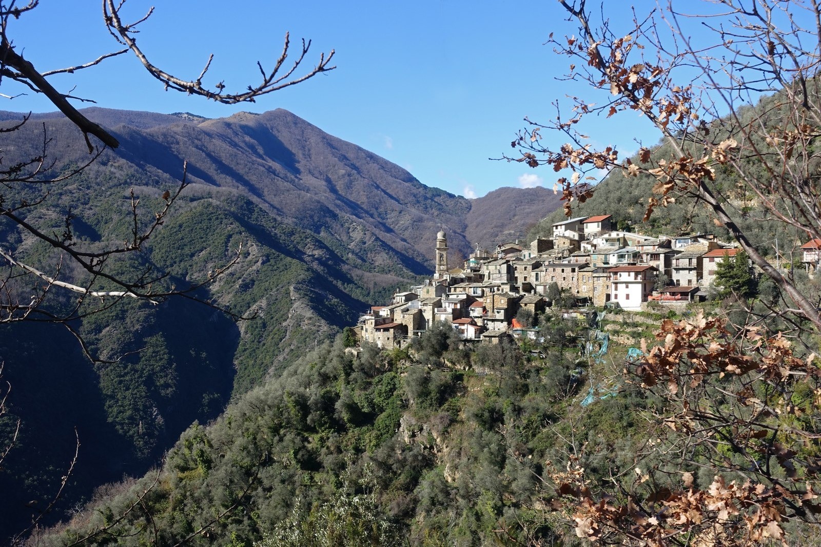 Avec 1627 mètres, le Monte Ceppo est le point culminant de moyennes montagnes au sud des Alpes Ligures. Les géographes disent en général que c'est un ensemble intermédiaire entre les Alpes, dans lequel il va se fondre à l'ouest, et la chaîne des Apennins à l'est. Le terrain est très encaissé entre les vallées de deux fleuves : la Nervia et l'Argentina. Ces montagnes sont couvertes majoritairement de feuillus. J'ai traversé d'immense hêtraies et le châtaignier est très présent. La culture de l'olivier est encore pratiquée, mais beaucoup moins qu'autrefois. J'ai vu aussi quelques plantations d'Eucalyptus Gunii, aux effluves agréables.