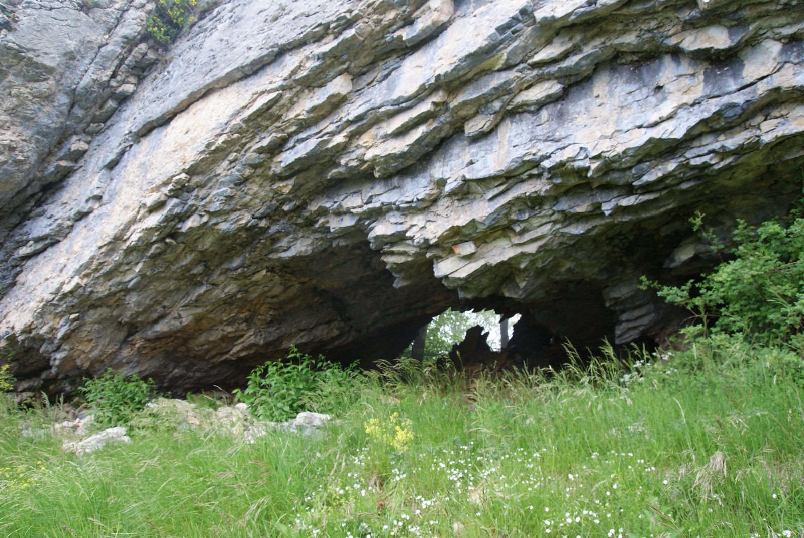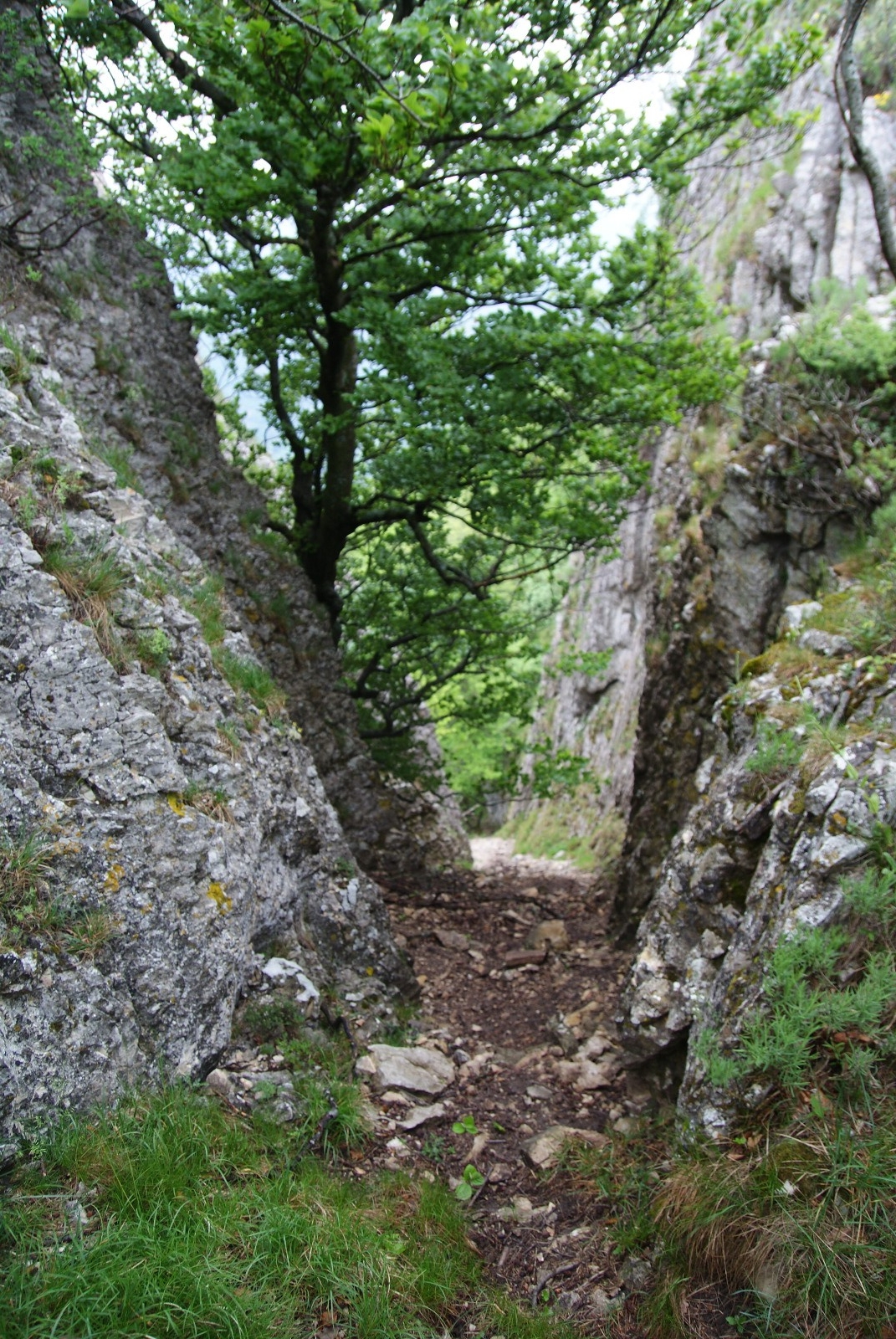 une belle arche) que nous n'avons, hélas, pas trouvée. Celle de gauche amène au pas, une faille permettant de descendre coté nord. La sente se perd dans les pentes herbeuses un peu avant le pas.