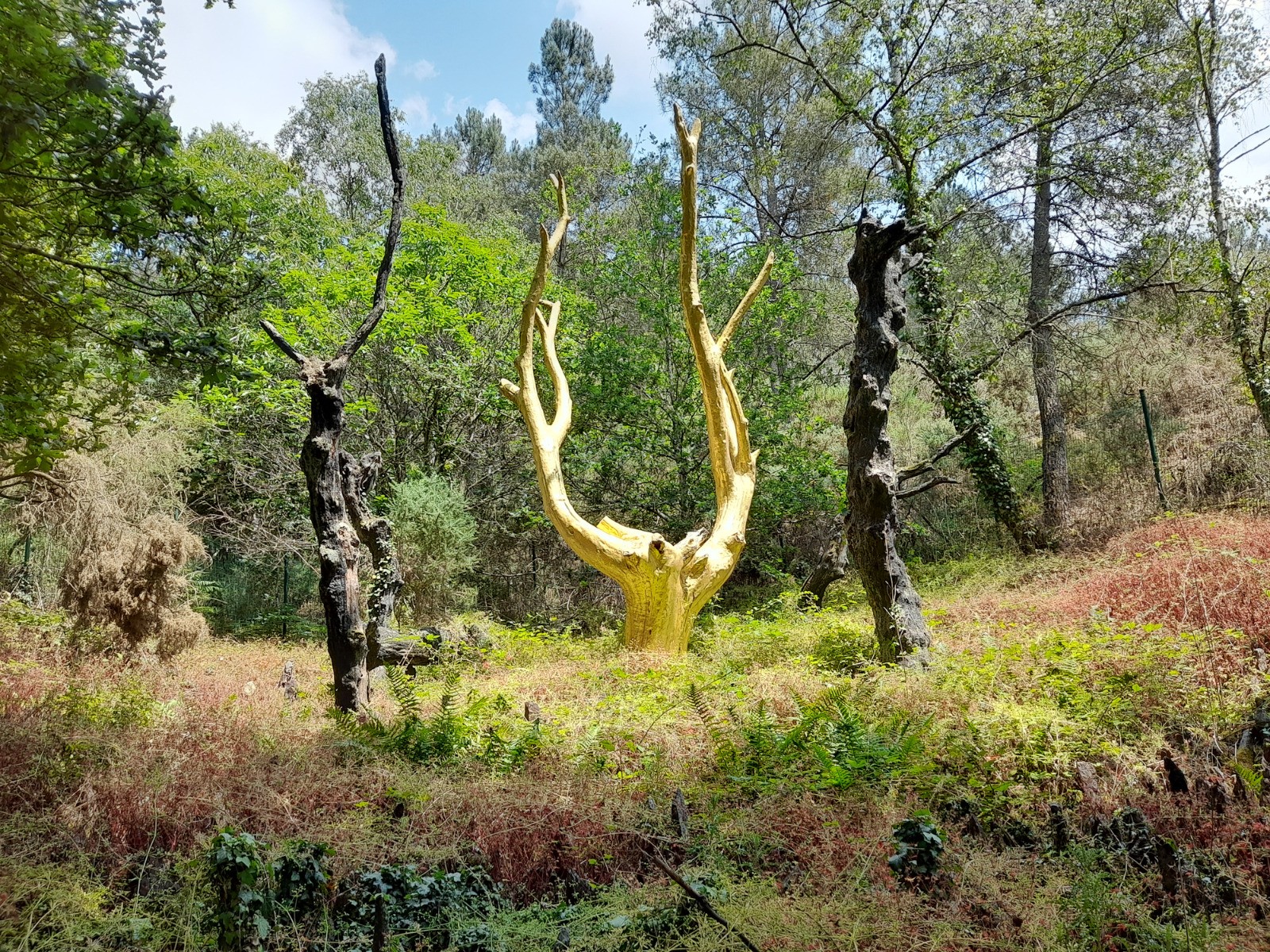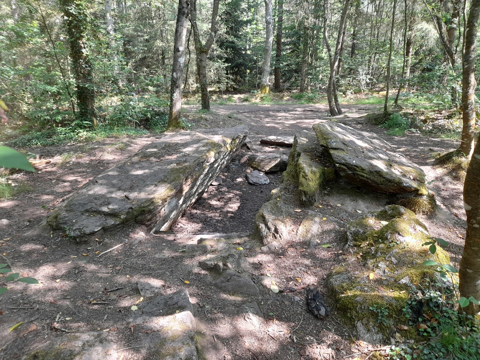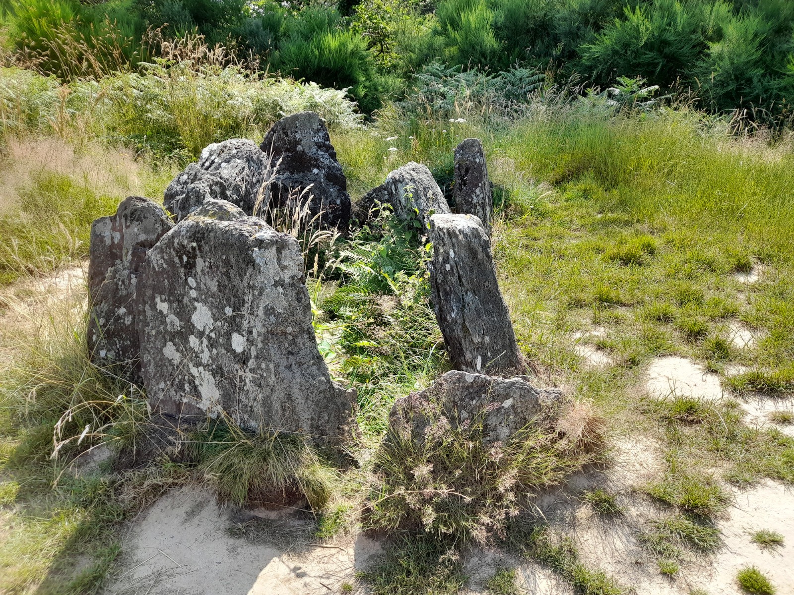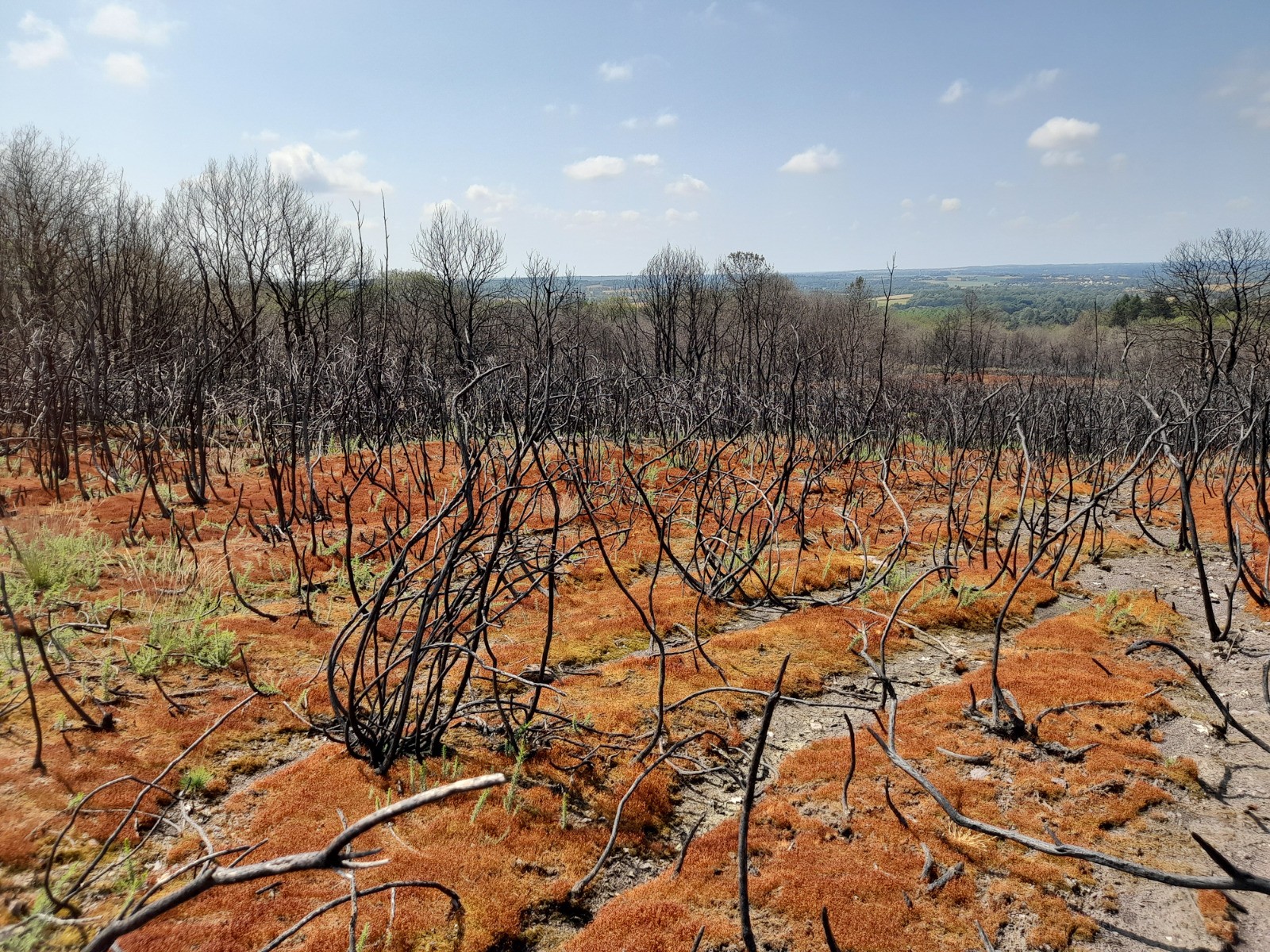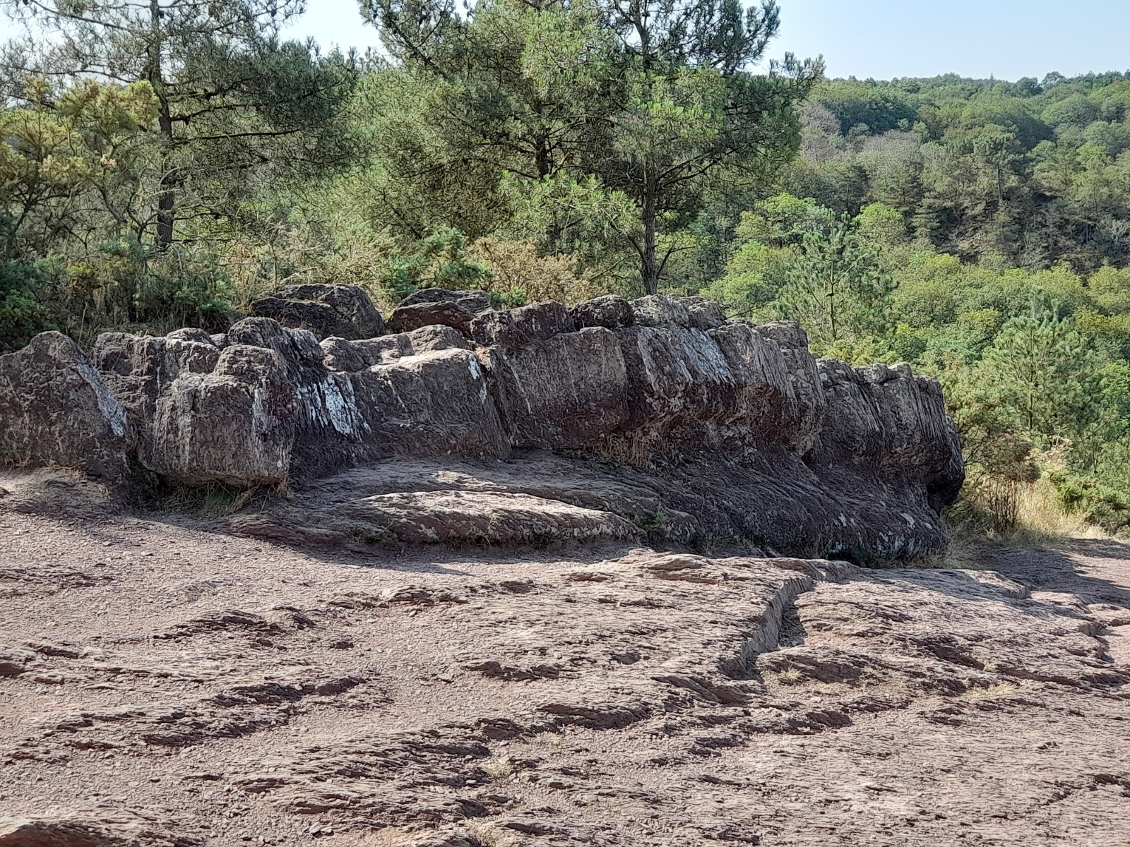 Bonjour, pouvais pas passer à côté, à 2h23 du gîte, mais regrette pas. sur le départ un paysage presque lunaire, normal en forêt de Merlin. Un petit bain quand même au passage, ça manquait. Un dolmen écroulé plus loin, le tombeau du géant qui à, suggéré une petite pose. Quelques grosses machines forestière et un détour, dans les brûlis de l'an passé. Normalement aurait du me retrouver dans les buisson d'épines, impressionnant ce que peut faire un feu de forêt. Un château plus en avant et une tour qui à subit les assauts du feu, un arbre en or.. Un conteur d’histoire devant une colonie de vacance et l'église pour clore le chapitre.