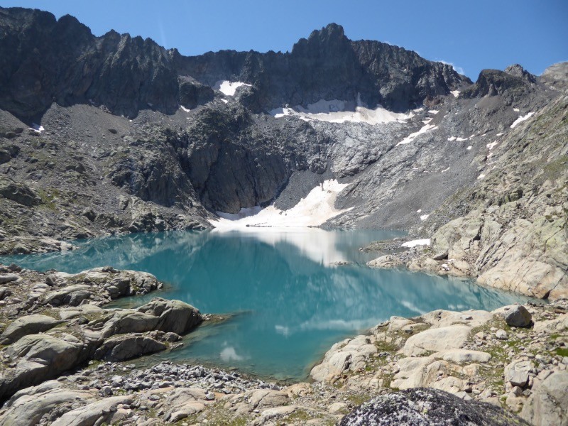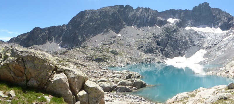 Une course au superbe Lac Tourat. Ce lac est enchâssé dans un décor superbe que domine le Pic Long 3192m. Le glacier est petit mais on devine la partie d'ablation qui devait être recouverte il y a encore une dizaine d'années.