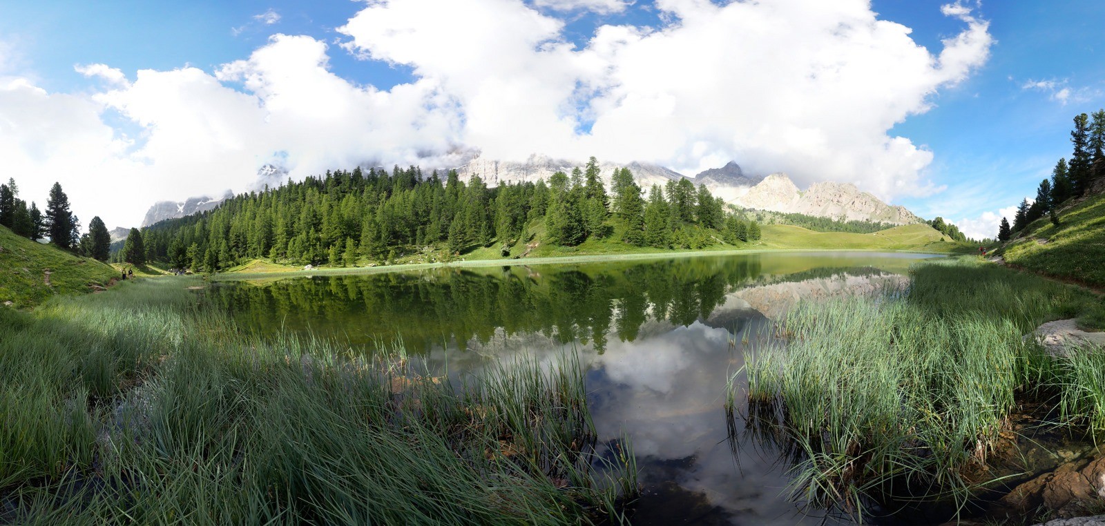 depuis le Pied du Mélezet, 1680 m > GR 5, GRP Tour de la Font Sancte, jusqu'à sa traversée du Ruisseau de la Pisse > sente non balisée du Pas du Curé, et effectuer la boucle pour rendre visite au Pin Cembro remarquable > suivre au mieux, pratiquement à niveau, la courbe de niveau 2400 m jusqu'à la petite dépression du Lac des Rouites > en faire presque le tour > poursuivre par les ondulations Est pour la vue qu'elles offrent sur le probable glacier fossile des Rouites, en rejoindre l'ancienne moraine rive droite pour la vue sur le vieux mélézin de la combe qui suit > descente abrupte sur le Lac Miroir parmi les rhododendrons (ou rester plus à gauche dans une plus faible pente !) > pour tenter une liaison plus sauvage, rallier les abords du Lac Ste-Anne en passant par son Collet ce qui rend sa découverte un peu plus spectaculaire > puis suivre et traverser au mieux jusqu'à rejoindre le GR 5 par lequel on arrive au Col Girardin, 2699 m (et sa Tête, 2875 m, par sa crête Ouest, si affinités !) > retour par le GR, puis hors sentier pour terminer le tour du Lac (mais attention, en début de saison, le lac est tellement plein que son sentier côtier en tirets noirs sur l'IGN est sous l'eau, la traversée à mi-pente n'est pas des plus facile et quelque peu exposée par endroit !) > après la Chapelle Ste-Anne, descendre sur le parking du Fond de Chaurionde par le sentier balisé ou emprunter le raccourci de la piste de ski qui, au prix d'une plus forte pente, économise un bon km et fait passer par une bien belle cascade.