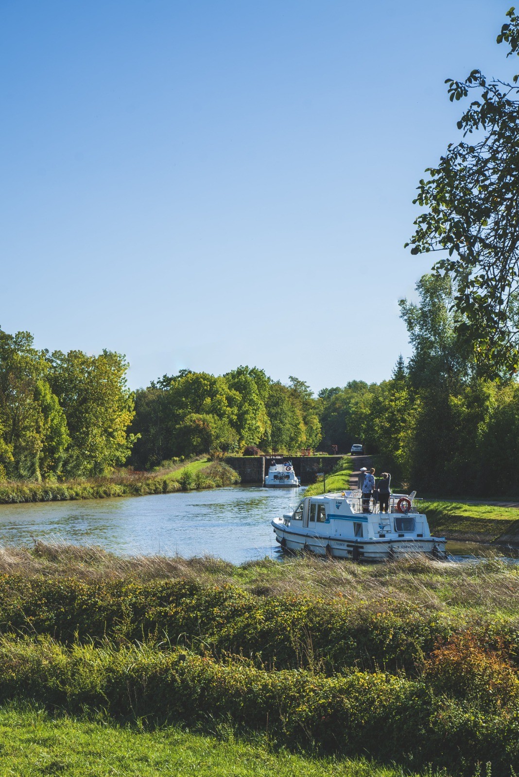 Prendre à gauche et suivre le chemin qui traverse les vignes et offre un superbe panorama sur le canal du Nivernais.