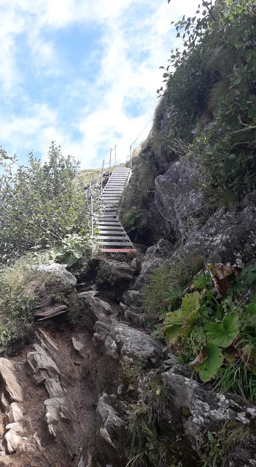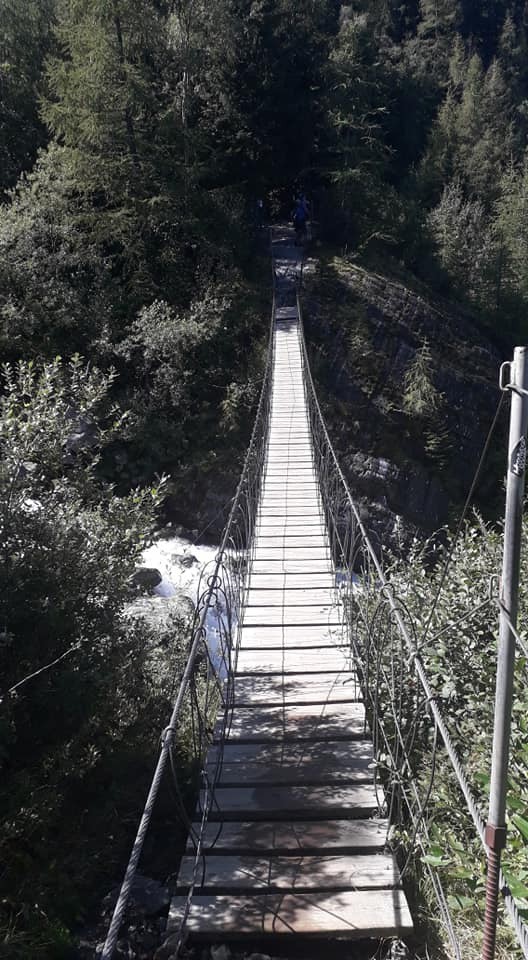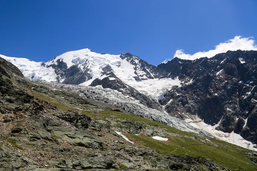 L'itinéraire que je propose passe par les alpages de l'Are et vient côtoyer au plus près le Glacier de Bionnassay au pied de la magnifique Aiguille du même nom. Le sentier est bien tracé et est sans difficulté jusqu'au bas du glacier. Toutefois, celui-ci s'enhardit lors de la montée de deux courtes échelles métalliques scellées dans la roche et le franchissement d'un passage rocheux équipé d'une main courante juste avant la gare du Nid d'Aigle.