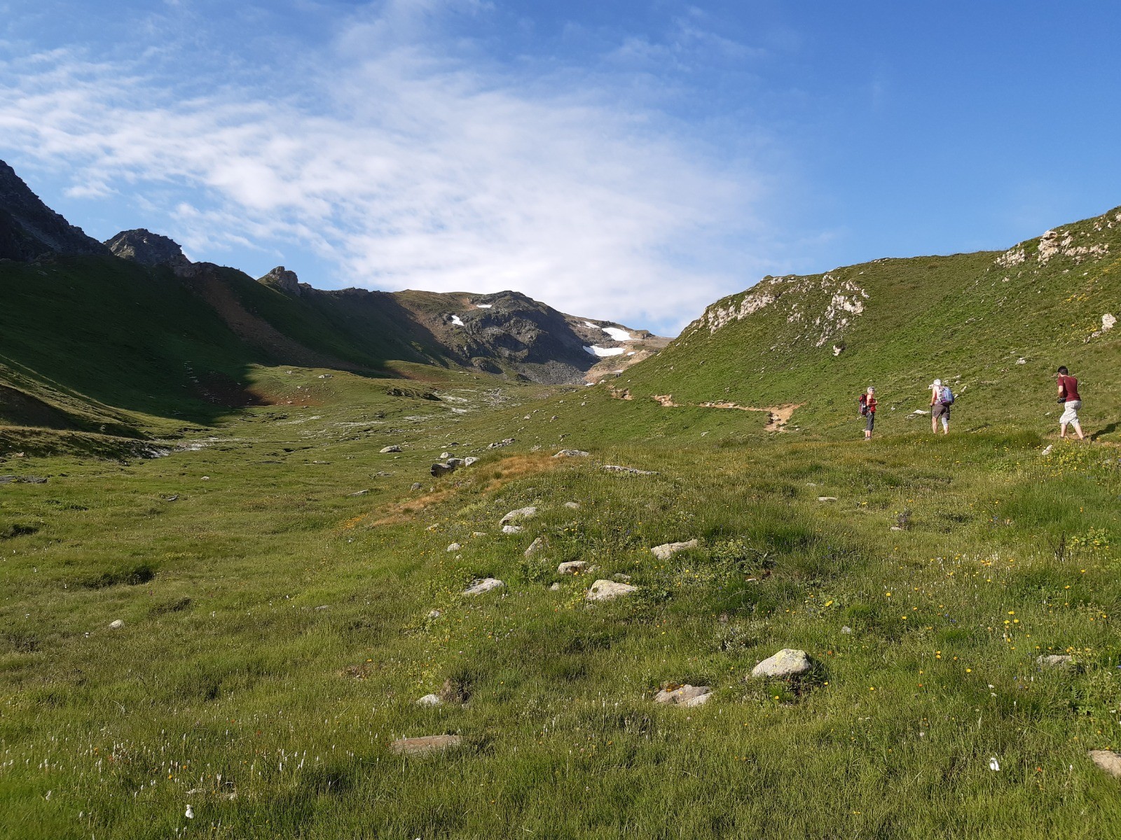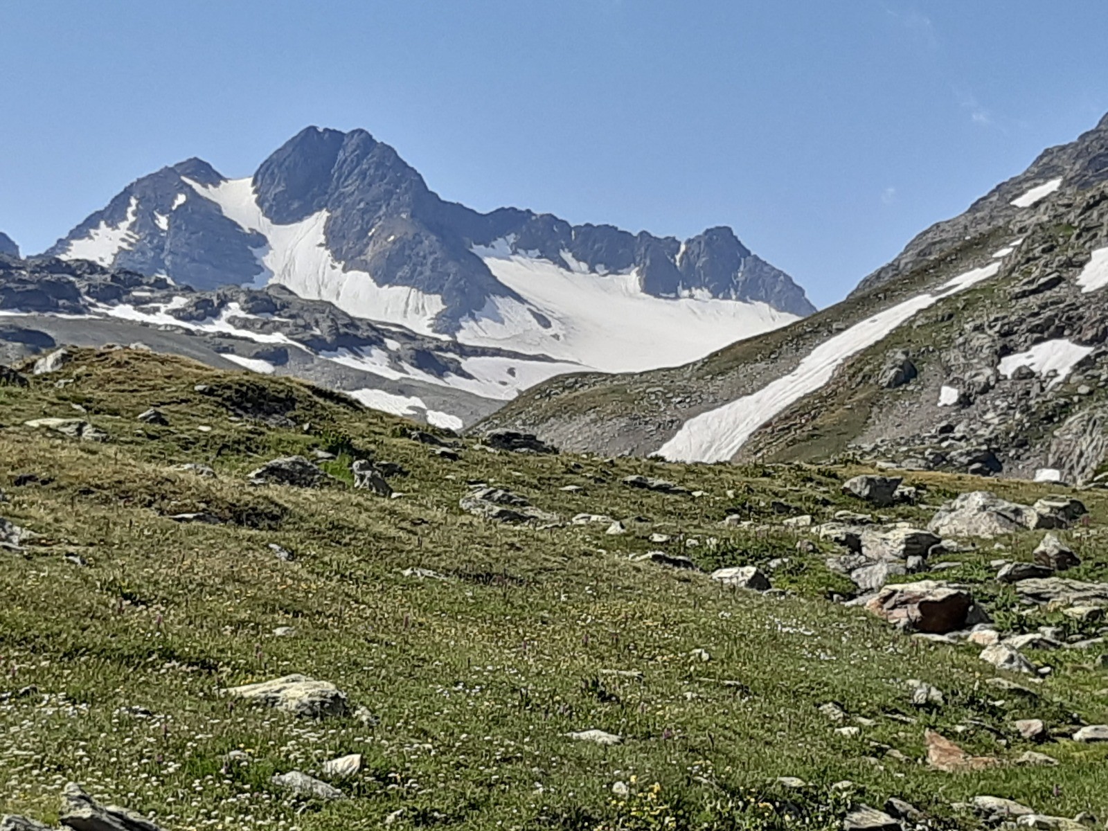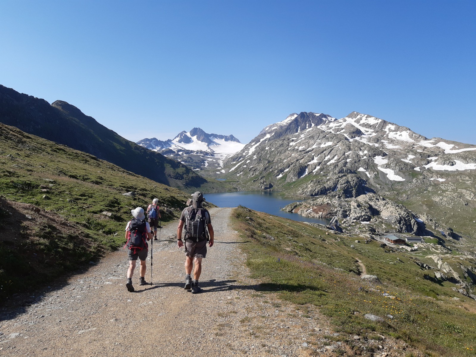 Départ au Col de la Croix de Fer. Suivre le sentier balisé en direction du refuge de l'Etendard et gagner le lac Tournant. Il est possible d'aller jusqu'au pied du glacier par un sentier non balisé : être équipé de chaussures rigides et étanches et de bâtons car il est nécessaire de marcher sur des névets (même fin juillet). Pour repartir, nous avons gagné le téléphérique du Rouet : vue 360 ° avec table d'orientation. Du téléphérique, plutôt que de redescendre par la gauche au Col des Lacs, je conseille de prendre à droite au point Lat/Lon : 45.20824/6.18176. La vue sera beaucoup plus belle que par le sentier que nous avons pris qui lui emprunte les pistes de ski dans un paysage très minéral et sans intérêt.