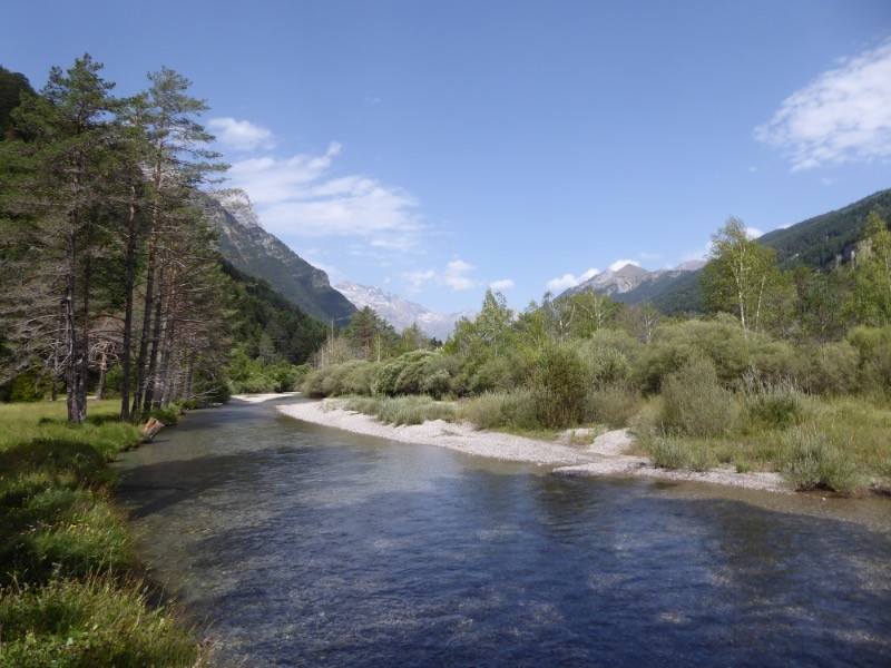 Depuis Bielsa le GR nous emmène vers l'embase de Pineta à travers une hêtraie et une sapinière. Le parcours est jalonné de panneaux informatifs relatifs à l'ornithologie. On peut apercevoir le cingle plongeur,le pic vert . Le cadre est majestueux car le cirque de Pineta se termine sous les cascades qui viennent du lac glacé du Marboré , vue sur le Mont Perdu et les falaises de Pineta. Une Brando pour les familles par excellence.