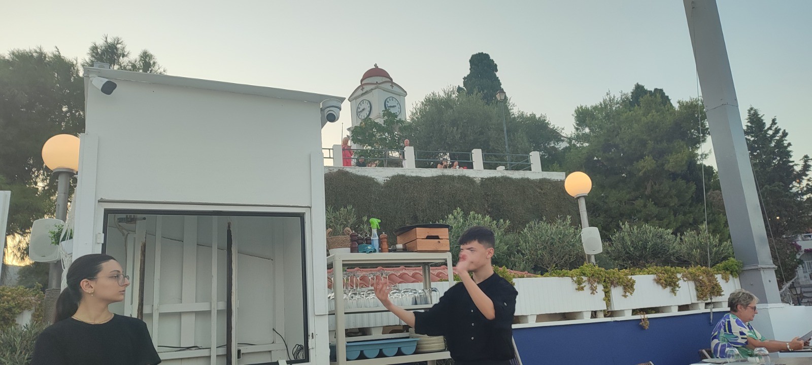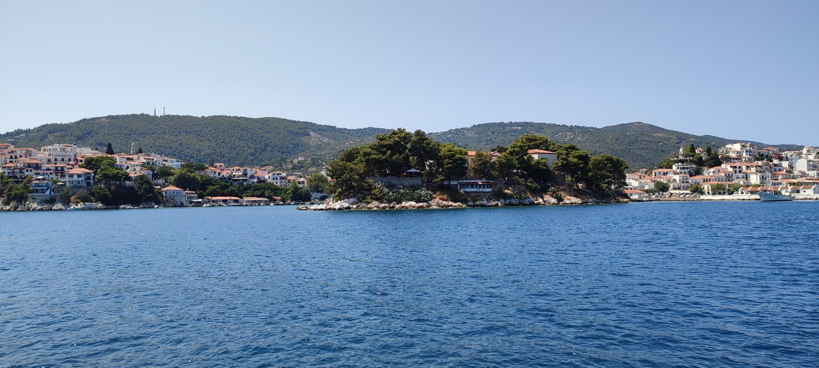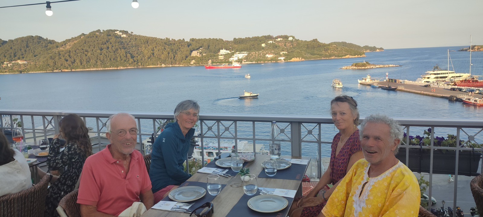 Déjeune au mouillage, nous repartons sur Skiatos, à l avoile. Bon vent. De la place au port, accostage, très joli l'arrivée sur Skiatos. Ballade dans le village, glace, églises, restau tout en haut avec une superbe vue.