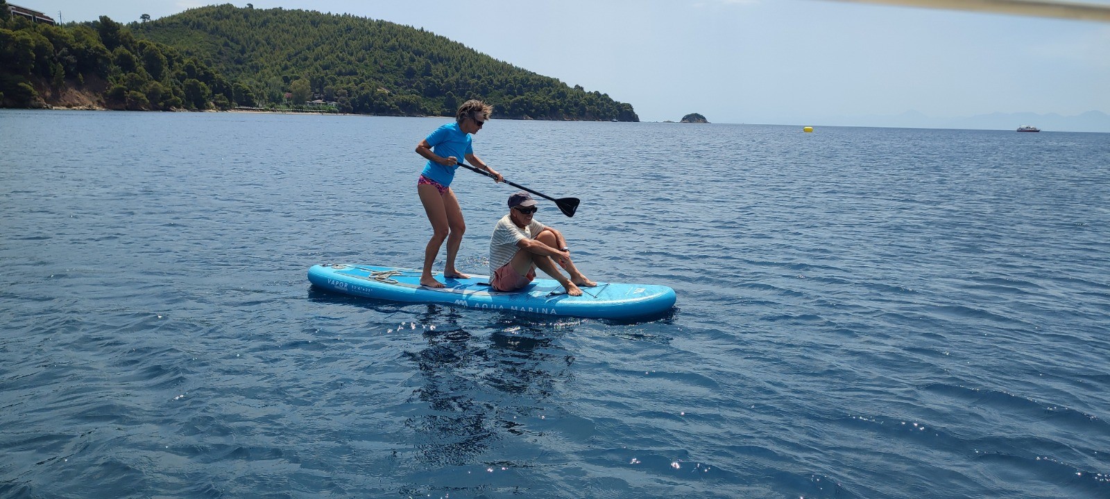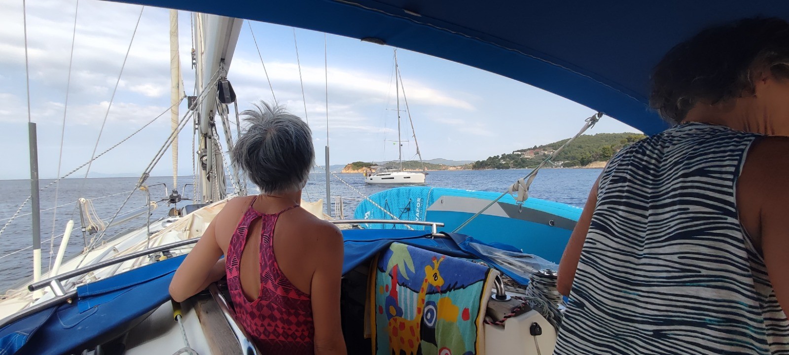 Petit dej au mouillage...Sylvie voit sur internet que la plage de Koukounaries est la 3eme plus belle plage de Méditerranée.